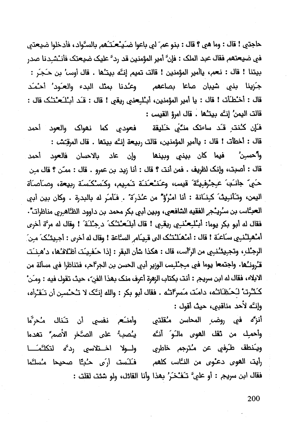 قال: أصبت، وإنك لظريف. فمن أنت؟ قال أنا زيد بن عمرو. قال: ممن؟ قال من حي جانب عجرفية قيس، وعنعنة تميم، وكسكسة ربيعة وصأصأة اليمن وتأنيث كنانة: أنا امرؤ من عذرة. فأمر له بالبدرة. وكان بين أبي العباس بن سريج الفقيه الشافعي، وبين أبي بكر محمد بن داود الظاهري مناظرات. فقال له أبو بكر يوما: أبلعني ريقي! قال أبلعتك دجلة! وقال له مرة أخرى أمهلني ساعة! قال: أمهلتك إلى قيام الساعة! وقال له أخرى: أجيئك من الرجل، وتجيئني من الرأس، قال: هكذا شأن البقر: إذا حفيت أظلافها، دهنت قرونها. واجتمعا في مجلس الوزير أبي الحسن بن الجراح فتناظرا في مسألة من الأبلاء، فقال له أبن سريج: أنت بكتاب الزهرة اعرف منك بهذا الفن، حيث تقول فيه: ومن كثرت لحظاته، دامت مسراته. فقال أبو بكر: والله انك لا تحسن أن تقرأه، وإنّه لأحد مناقبي حيث أقول: