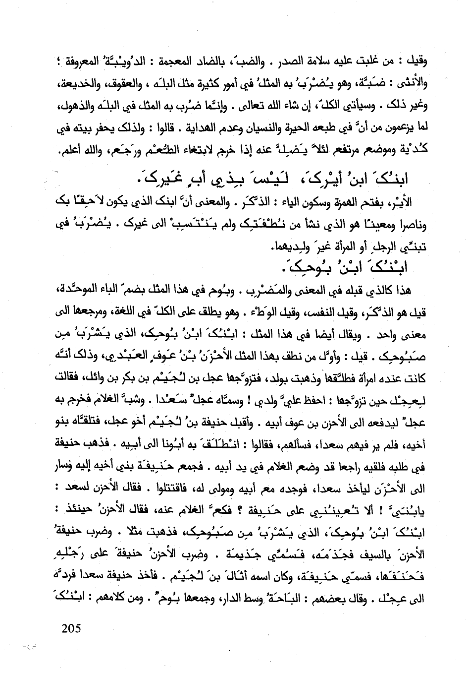 هذا كالذي قبله في المعنى والمضروب. وبوح في هذا المثل بضم الباء الموحدة قيل هو الذكر وقيل النفس وقيل الوطء. وهو يطلق على الكل في اللغة ومرجعها إلى معنى واحد. ويقال أيضاً في هذا المثل: ابنك أبن بوحك الذي يشرب من صبوحك. قيل: وأول من نطق بهذا المثل الأحزن بن عوف العبدي وذلك إنّه كانت عنده امرأة فطلقها وذهبت بولد فتزوجها عجل بن لجيم بن بكر بن وائل فقالت لعجل حين تزوجها: أحفظ علي ولدي! وسماه عجل سعدا. وشب الغلام فخرج به عجل ليدفعه إلى الأحزن بن عوف أبيه. وأقبل حنيفة بن لجم أخو عجل فتلقاه بنو أخيه فلم ير فيهم سعدا فسألهم فقالوا: انطلق به أبونا إلى أبيه. فذهب حنيفة في طلبه فلقيه راجعا قد وضع الغلام في يد أبيه. فجمع حنيفة بني أخيه إليه وسار إلى الأحزن ليأخذ سعدا فوجده مع أبيه ومولى له فاقتتلوا. فقال الأحزن لسعد: يا بني! إلاّ تعينني على حنيفة؟ فكع الغلام عنه، فقال الأحزن حينئذ: ابنك أبن بوحك الذي يشرب من صبوحك فذهبت مثلا. وضرب حنيفة الأحزن بالسيف فجذمه فسمي جذيمة. وضرب الأحزن حنيف على رجله فحنفها فسمي حنيف وكان اسمه اثال بن لجيم. فأخذ حنيف سعدا فرده إلى عجل. وقال بعضهم: الباحة وسط الدار وجمعها بوح. ومن كلامهم: ابنك