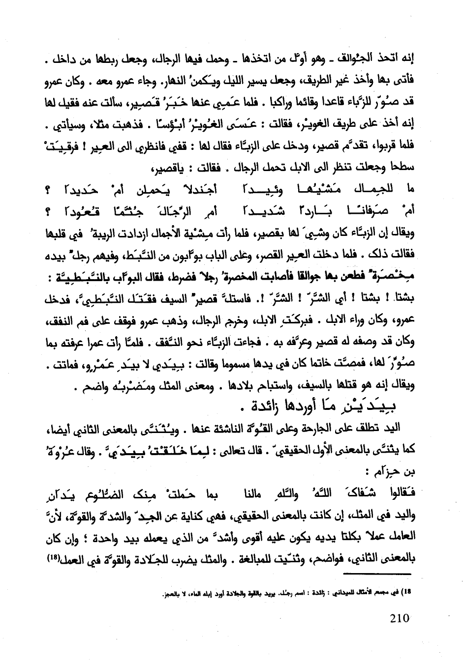 ويقال إنَّ الزباء كان وشي لها بقصير فلما رأت مشية الأجمال ازدادت الريبة في قلبها فقالت ذلك. فلما دخلت العير القصر وعلى الباب بوابون من النبط وفيهم رجل بيده مخصرة فطعن بها جوالقا فأصابت المخصرة رجلا فضرط فقال البواب بالنبطية: بشتا! بشتا! أى الشر! الشر! فاستل قصير السيف فقتل النبطي فدخل عمرو وكان وراء الإبل. فبركت الإبل وخرج الرجال وذهب عمرو فوقف على فم النفق وكان قد وصفه له قصير وعرفه به. فجاءت الزباء نحو النفق. فلما رأت عمرا عرفته بما صور لها فمصت خاتما كان في يدها مسموما وقالت: بيدي لا بيد عمرو فماتت. ويقال إنّه هو قتلها بالسيف واستباح بلادها. ومعنى المثل ومضربه واضح.