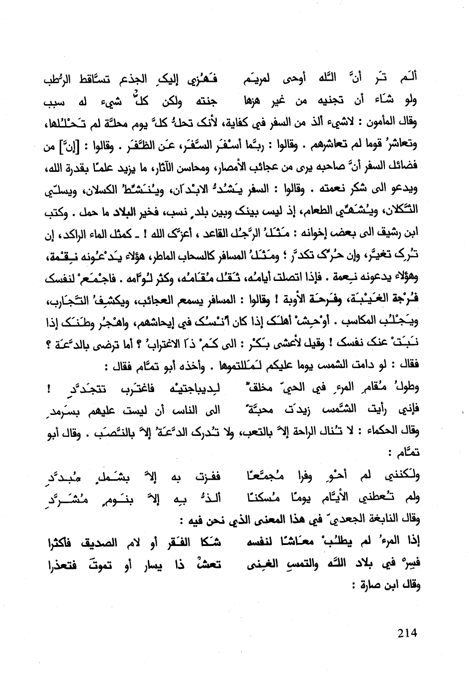 وقال المأمون: لا شيء ألذ من السفر في كفاية، لأنك تحل يوم محلة لم تحللها، وتعاشر قوماً لم تعاشرهم. وقالوا: ربما أسفر السفر، عن الظفر. وقالوا: إنَّ من فضائل السفر أنَّ صاحبه يرى من عجائب الأمصار، ومحاسن الآثار، وأمثال يزيد علما بقدرة الله، ويدعو إلى شكر نعمته. وقالوا: السفر يشد الأبدان، وينشط الكسلان، ويسلي الثكلان، ويشهي الطعام، إذ ليس بينك وبين بلدٍ نسب، فخير البلاد ما حمل. وكتب أبن رشيق إلى بعض إخوانه: مثل الرجل القاعد، أعزك الله! كمثل الماء الراكد، وإنَّ ترك تغير، وإنَّ حرك تكدر؛ ومثل المسافر كالسحاب الماطر، هؤلاء يدعونه نقمة، وهؤلاء يدعونه نعمة. فإذا اتصلت أيامه، ثقل مقامة، وكثر لوامه. فاجمع لنفسك فرجة الغيبة، وفرحة الأوبة! وقالوا: المسافر يسمع العجائب، ويكشف التجارب، ويحلب المكاسب. أوحش أهلك إذا كان انسك في إيحاشهم، واهجر وطنك إذا نبت عنك نفسك! وقيل لأعشى بكر: إلى كم ذا الاغتراب؟ أما ترضى بالدعة؟ فقال: لو دامت الشمس يوماً عليكم لمللتموها. وأخذ أبو تمام فقال: