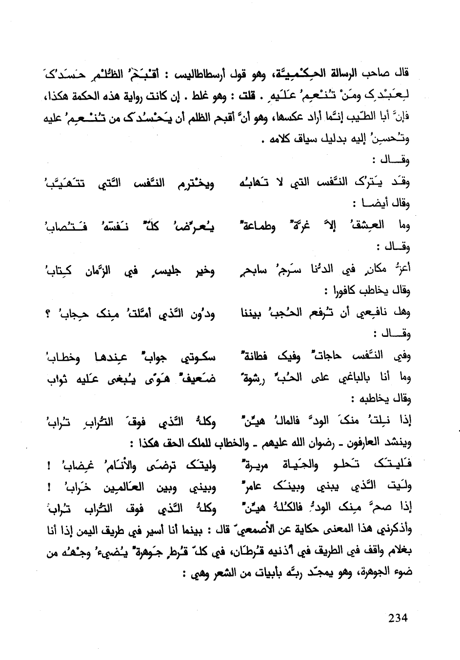 قال صاحب الرسالة الحكيمة وهو قول ارسطوطاليس: اقبح الظلم حسدك لعبدك ومن تنعم عليه. قلت: وهو غلط. إنَّ كانت رواية هذه الحكمة هكذا فإنَ أبا الطيب إنّما أراد عكسها وهو إنَّ اقبح الظلم إنَّ يحسدك من تنعم عليه وتحسن إليه بدليل سياق كلامه.