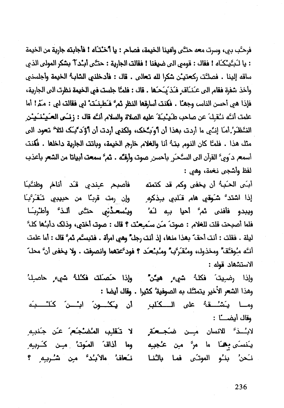 فرحب بي وسرت معه حتى وافينا الخيمة فصاح: يا أختاه فأجابته جارية من الخيمة: يا لبيكاه! فقال: قومي إلى ضيفنا فقالت الجارية: حتى ابدأ بشكر المولى الذي ساقه إلينا. فصليت ركعتين لله تعالى. قال: فأدخلني الشاب الخيمة وأجلسني وأخذ شفرة فقام إلى عناق فذبحها. قال: فلما جلست في الخيمة نظرت إلى الجارية فإذا هي احسن الناس وجها. فكنت اسارقها النظر ثم فطنت لي فقالت لي: مم! أنا علمت انه نقل عن صاحب طيبة عليه الصلاة والسلام إنّه قال: زنى العينين النظر. أما إني ما أردت بهذا إنَّ أوبخك ولكني أردت أن أؤدبك لئلا تعود إلى مثل هذا. فلما كان النوم بت أنا والغلام خارج الخيمة وباتت الجارية داخلها. فكنت اسمع دوي القرآن إلى السحر بأحسن صوت وارقه. ثم سمعت أبيات من الشعر بأعذب لفظ وأشجى نغمة وهي: