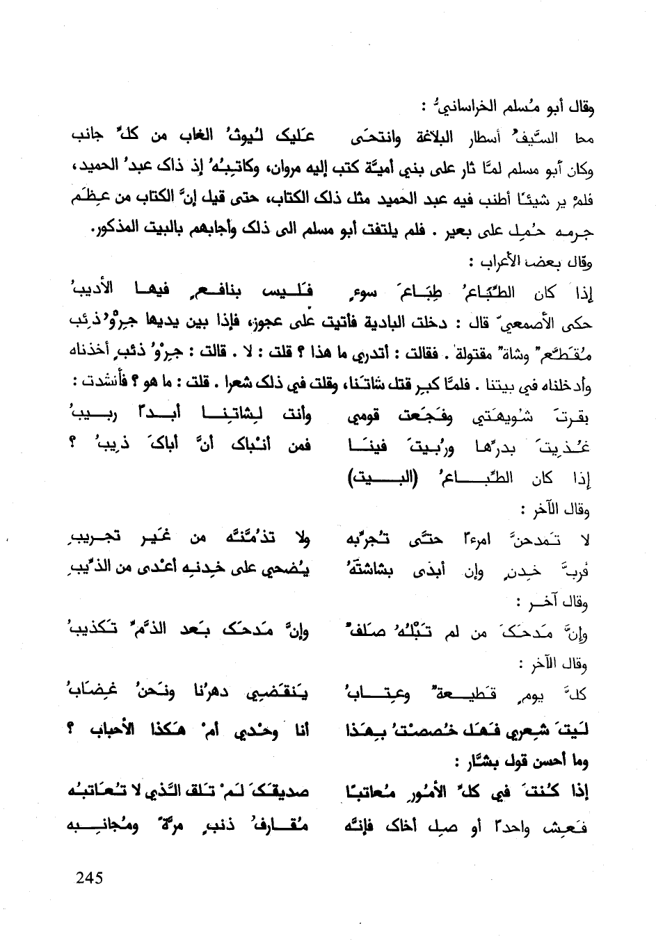 وكان أبو مسلم لمّا آثار على بني أمية كتب إليه مروان، وكاتبه إذ ذاك عبد الحميد، فلم يو شيئاً أطنب فيه عبد الحميد مثل ذلك الكتاب، حتى قيل إنَّ الكتاب من عظم جرمه حمل على بعير. فلم يلتفت أبو مسلم إلى ذلك وأجابهم بالبيت المذكور.