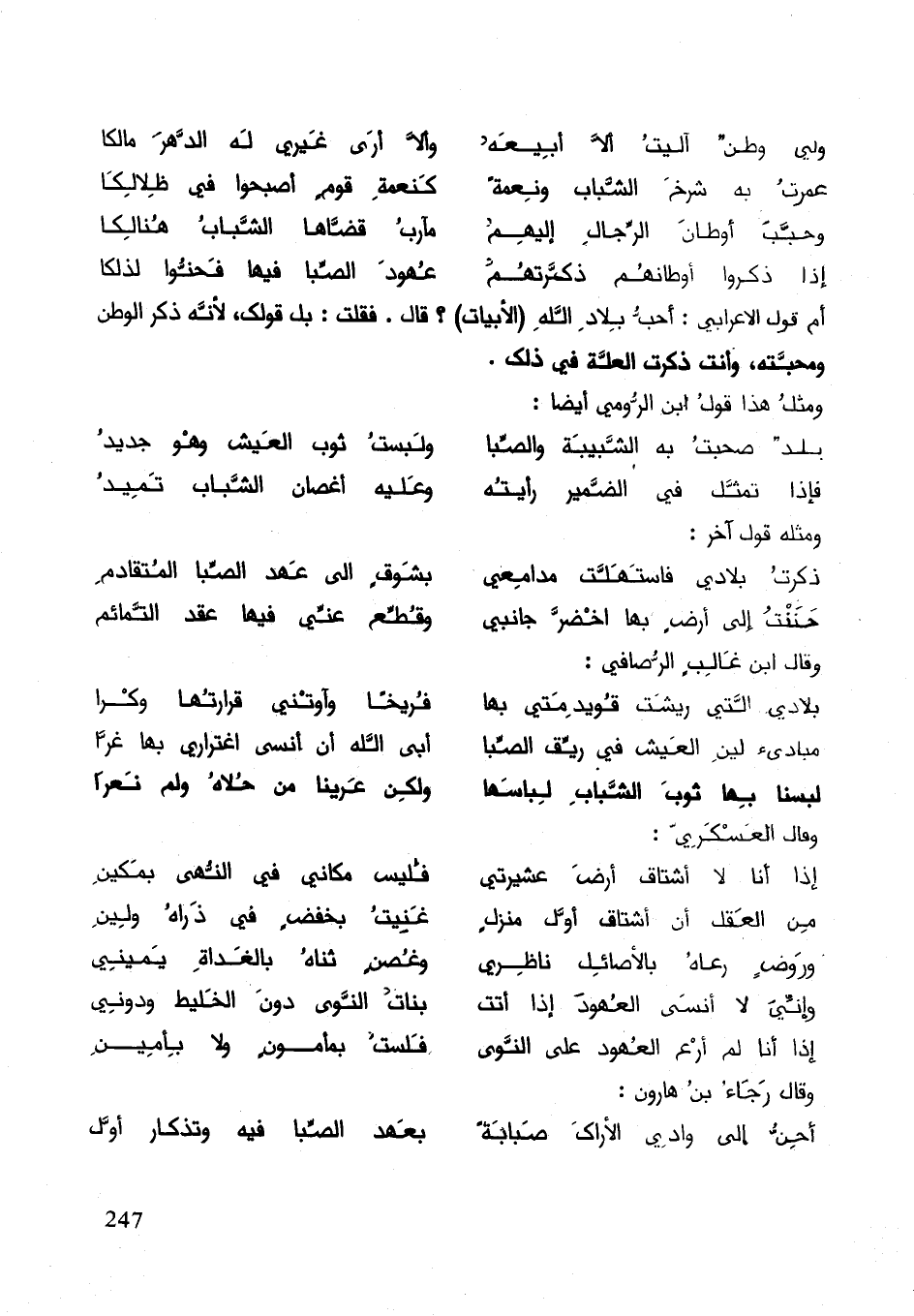 أم قول الأعرابي: احب بلاد الله الأبيات؟ قال. فقلت: بل قولك، لأنّه ذكر الوطن ومحبته، وأنت ذكرت العلة في ذلك.