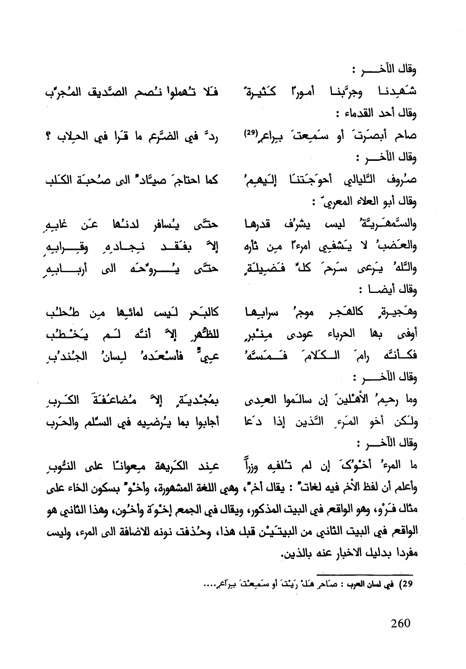 وأعلم أنَّ لفظ الأخ فيه لغات كثيرة: يقال أخ، وهي اللغة المشهورة، وأخو بسكون الخاء على مثال فرو، وهو الواقع في البيت المذكور ويقال في الجمع اخوة وأخون، وهذا الثاني هو الواقع في البيت الثاني من البيتين قبل هذا، وحذفت نونه للإضافة إلى المرء، وليس مفردا بدليل الإخبار عنه بالذين.