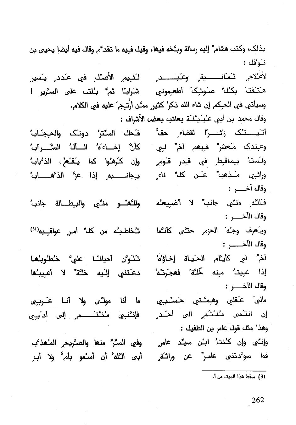 بذلك، وكتب هشام إليه رسالة وبخه فيها، وقيل فيه ما تقدم وقال فيه أيضاً يحيى بن نوفل: