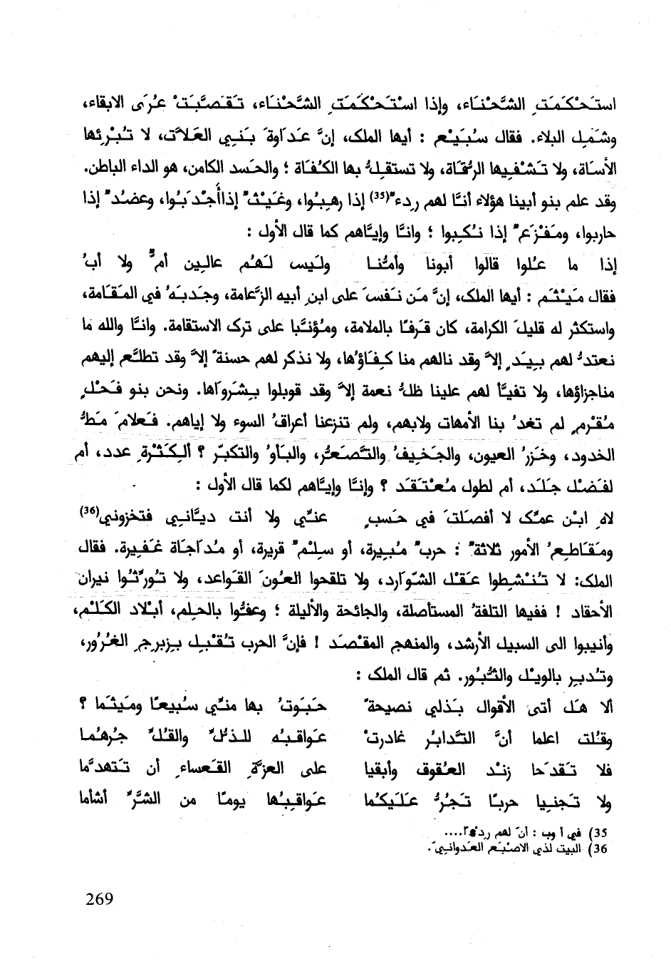ومقاطع الأمور ثلاثة: حرب مبيرة أو سلم قريرة أو مداجاة غفيرة. فقال الملك: لا تنشط عقل الشوادر ولا تلقحوا العون القواعد، ولا تورثوا نيران الأحقاد! ففيها التلفة المستأصلة والجائحة والأليلة؛ وعفو بالحلم، أبلاد الكلم، وأنيبوا إلى السبيل الأرشد، والمنهج المقصد! فإنَ الحرب تقبل بزبرج الغرور وتدبر بالويل والثبور. ثم قال الملك: