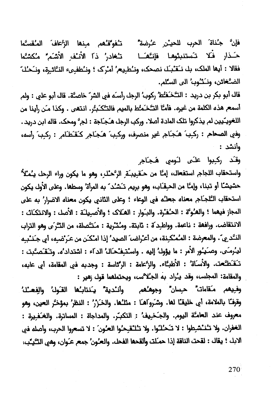 قال أبو بكر بن دريد: التحفظ ركوب الرجل رأسه في الشر خاصة. قال أبو علي: ولم أسمع هذه الكلمة من غيره. فأما التخمط بالميم فالتكبر. انتهى. وكذا من رأينا من اللغويين لم يذكروا تلك المادة أصلا. وركب الرجل هجاجة: لج ومحك. قاله أبن دريد. وفي الصحاح: ركب هجاج غير منصرف، وركب هجاج كقطام: ركب رأسه، وأنشد: وقد ركبوا عاى لومي هجاج واستحقاب اللجاج استفعال، إما من حقيبة الرجل، وهو ما يكون وراء الرجل يملأ حشيشا أو تبنا وإما من الحقاب وهو بريم تشد به المرأة وسطها. وعلى الأول يكون استحقاب اللجاج معناه جعله في الوعاء؛ وعلى الثاني يكون معناه الأضرار به على المجاز فيهما؛ والهوة: الحفرة. والبوار: الهلاك؛ والأصيلة: الأصل: والانتكاث: الانتقاض. ورافة: ناعمة. وواطدة: ثابتة. ومثرية: متصلة، من الثرى وهو التراب الندي. والمعرضة: الممكنة، من أعراض الصيد إذا أمكن من عرضه أي جنيه ليرمى. وصيور الأمر: ما يؤول إليه. واستفحال الداء: اشتداده. وتقصبت: تقطعت. والأساة: الأطباء. والزعامة: الرئاسة: وجدبه في المقامة، أي عابه، والمقامة: المجلس وقد يراد به الجلاي، ويحتملهما قول زهير: