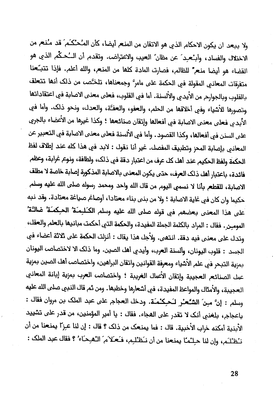 ولا يبعد أن يكون الإحكام هو الإتقان من المنع أيضاً، كأن المحكم قد منع من الاختلال والفساد، وأبع عن مظان العيب والاعتراض. وتقدم أن الحكم الذي هو القضاء هو أيضاً منع للظلم، فصارت المادة كلها من المنع، والله اعلم. فإذا تتبعنا متفرقات المعاني المقولة في الحكمة على ما مر وجمعناها من ذلك أنها تتعلق بالقلوب والجوارح من الأيدي والألسنة. أما في القلوب، فعلى معنى الإصابة في اعتقاداتها وتصورها للأشياء وفي أخلاقها من الحلم، والعفو، والعفة، والعدل، ونحو ذلك. وأما في الأيدي فعلى معنى الإصابة في أفعالها وإتقان صنائعها؛ وكذا غيرها من الأعضاء بالجري على السنن في أفعالها، وكذا القصود. وأما في الألسنة فعلى معنى الإصابة في التعبير عن المعاني بإصابة المحز وتطبيق المفصل. غير أنا نقول: لابد في هذا كله عند إطلاق لفظ الحكمة ولفظ الحكيم عند أهل كل عرف من اعتبار دقة في ذلك، ولطافة، ونوع غرابة، وعظم فائدة، باعتبار أهل ذلك العرف، حتى يكون المعنى بالإصابة المذكورة إصابة خاصة لا مطلق الإصابة، للقطع بأنا لا نسمي اليوم من قال الله واحد ومحمّد رسوله صلى الله عليه وسلم حكيما وإن كان في غاية الإصابة؛ ولا من بنى بناء معتادا، أو صاغ صياغة معتادة. وقد نبه على هذا المعنى بعضهم في قوله صلى الله عليه وسلم الكلمة الحكمة ضالة المؤمن. فقال: المراد بالكلمة الجملة المفيدة، والحكمة التي أحكمت مبانيها بالعلم والعقل، وتدل على معنى فيه دقة، انتهى. ولأجل هذا يقال: أنزلت الحكمة على ثلاثة أعضاء في الجسد: قلوب اليونان، وألسنة العرب، وأيدي أهل الصين. وما ذلك إلاّ لاختصاص اليونان بميزة التبحر في علم الأشياء ومعرفة القوانين وإتقان البراهين، واختصاص أهل الصين بميزة عمل الصنائع العجيبة وإتقان الأعمال الغريبة؛ واختصاص العرب بمزية إبانة المعاني العجيبة، والأمثال والمواعظ المفيدة، في أشعارها وخطبها. ومن ثم قال النبي صلى الله عليه وسلم إنّ من الشعر لحكمة. ودخل العجاج على عبد الملك بن مروان فقال: يا عجاج، بلغني أنك لا تقدر على الهجاء. فقال: يا أمير المؤمنين، من قدر على تشييد الأبنية أمكنه خراب الأخبية. قال: فما يمنعك من ذلك؟ قال: إنّ لنا عزا يمنعنا من أن نظلم، وإنّ لنا حاما يمنعنا من أن نظلم، فعلام الهجاء؟ فقال عبد الملك: