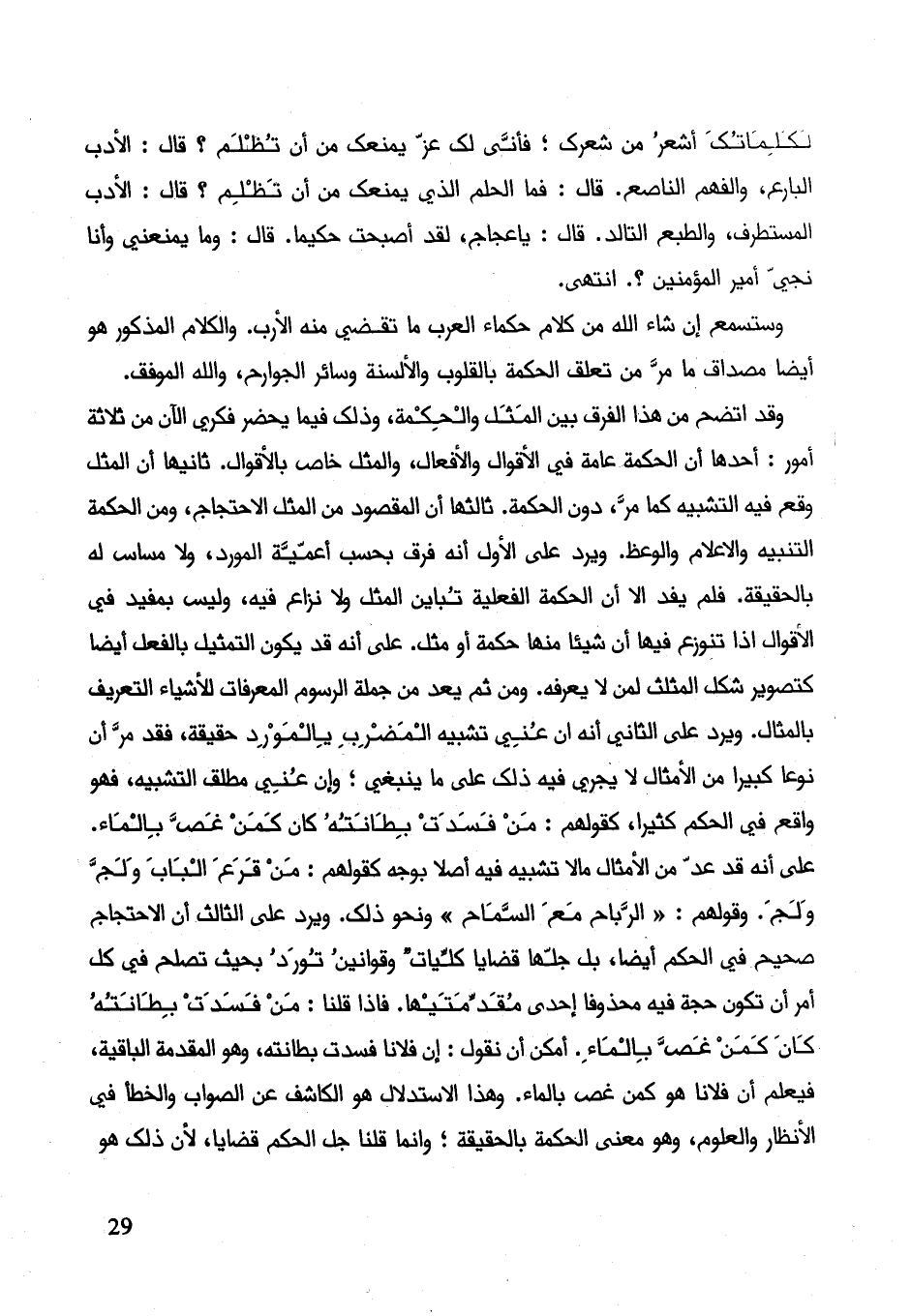 وستسمع أن شاء الله من كلام حكماء العرب ما تقضي منه الأرب. والكلام المذكور هو أيضاً مصداق ما مر من تعلق الحكمة بالقلوب والألسن وساير الجوارح، والله الموفق. وقد اتضح من هذا الفرق بين المثل والحكمة، وذلك فيما يحضر فكري الآن من ثلاثة أمور: أحدها أن الحكمة عامة في الأقوال والأفعال، والمثل خاص بالأقوال. ثانيها أن المثل وقع فيه التشبيه كما مر، دون الحكمة. ثالثها أن المقصود من المثل الاحتجاج، ومن الحكمة التنبيه والإعلام والوعظ. ويرد على الأول إنّه فرق بحسب أعمية المورد، ولا مساس له بالحقيقة. فلم يفد إلاّ أن الحكمة الفعلية تباين المثل ولا نزاع فيه، وليس بمفيد في الأقوال إذا تنوزع فيها أن شيئا منها حكمة أو مثل. على أنه قد يكون التمثيل بالفعل أيضاً كتصوير شكل المثلث لمن لا يعرفه. ومن ثم يعد من جملة الرسوم المعروفات الأشياء التعريف بالمثال. ويرد على الثاني أنه إن عنى تشبيه المضرب بالمورد حقيقة، فقد مر أن نوعا كبيرا من الأمثال لا يجري فيه ذلك على ما ينبغي؛ وإن عني مطلق التشبيه، فهو واقع في الحكم كثيرا، كقولهم: من فسدت بطانته كان كمن غص بالماء. على أنه قد عد من الأمثال ملا تشبيه فيه أصلا بوجه كقولهم: من قرع الباب ولجَّ ولج. وقولهم: " الرباح مع السماح " ونحو ذلك. ويرد على الثالث أن الاحتجاج صحيح في الحكم أيضاً، بل جلها قضايا كليات وقوانين تورد بحيث يصلح في كل أمر تكون حجة فيه محذوفة إحدى مقدمتيها. فإذا قلنا: من فسدت بطانته كان كمن غص بالماء أمكن إنّ نقول: إن فلان فسدت بطانته، وهو المقدمة الباقية، فيعلم أن فلانا هو كمن غص بالماء. وهذا الاستدلال هو الكاشف عن الصواب والخطأ في الأنظار والعلوم، وهو معنى الحكمة بالحقيقة؛ وإنما قلنا جل الحكم قضايا، لأن ذلك هو