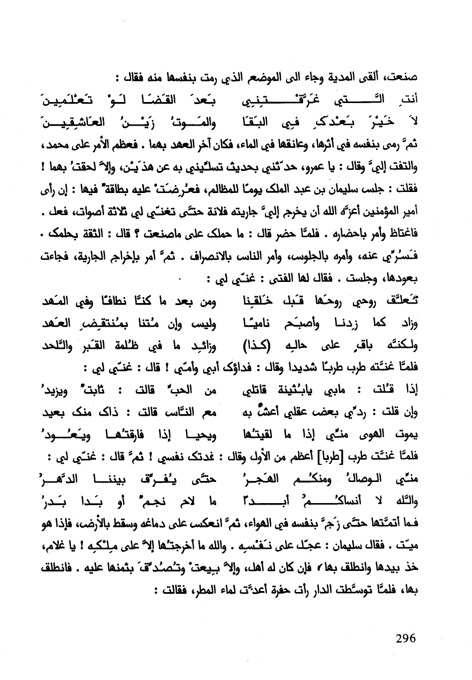ثم رمى بنفسه في أثرها وعانقها في الماء، فكان آخر العهد بهما. فعظم الأمر على محمد والتفت إلي وقال: يا عمرو، حدثني بحديث تسليني به عن هذين، وإلاّ لحقت بهما! فقالت: جلس سليمان بن عبد الملك يوما للمظالم فعرضت عليه بطاقة فيها: إن رأى أمير المؤمنين أعزه الله أن يخرج ألي جاريته فلانه حتى تغني لي ثلاثة أصوات فعل. فاغتاظ وأمر بإحضاره. فلما حضر قال: ما حملك على ما صنعت؟ قال: الثقة بحلمك. فسري عنه وأمره بالجلوس وأمر الناس بالانصراف. ثم أمر بإخراج الجارية فجاءت بعودها وجلست. فقال لها الفتى: غني لي: