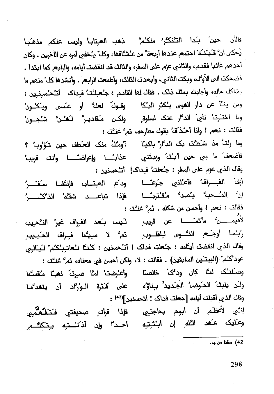 فضحكت إلى الأول، وبكت إلى الثاني، وأبعدت الثالث، وأطمعت الرابع. وانشدها كل منهم ما يشاكل حاله، وأجابته بمثل ذلك. فقال لها القادم: جعلت فداك أتستحسنين: