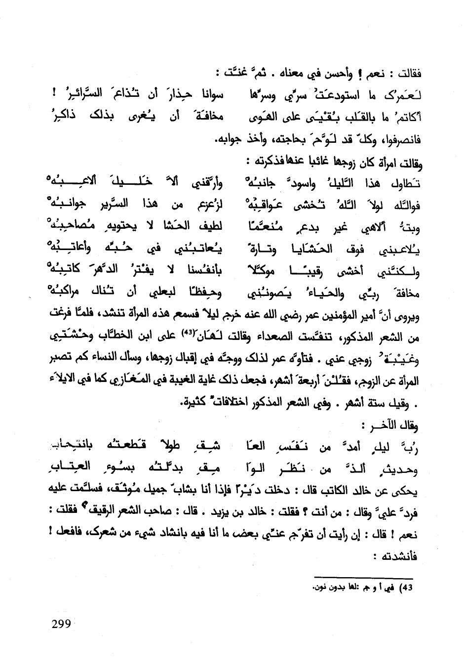 ويروى أنَّ أمير المؤمنين عمر رضي الله عنه خرج ليلا فسمع هذا المرأة تنشد، فلما فرغت من الشعر المذكور، تنفست الصعداء وقالت لهان على أبن الخطاب وحشتي وغيبة زوجي عني. فتأوه عمر لذلك ووجه في إقبال زوجها، وسأل النساء كم تصبر المرأة عن الزوج، فقلن أربعة اشهر، فجعل ذلك غاية الغيبة في المغازي كما في الايلاء وقيل ستة اشهر. وفي الشعر المذكور اختلافات كثيرة.