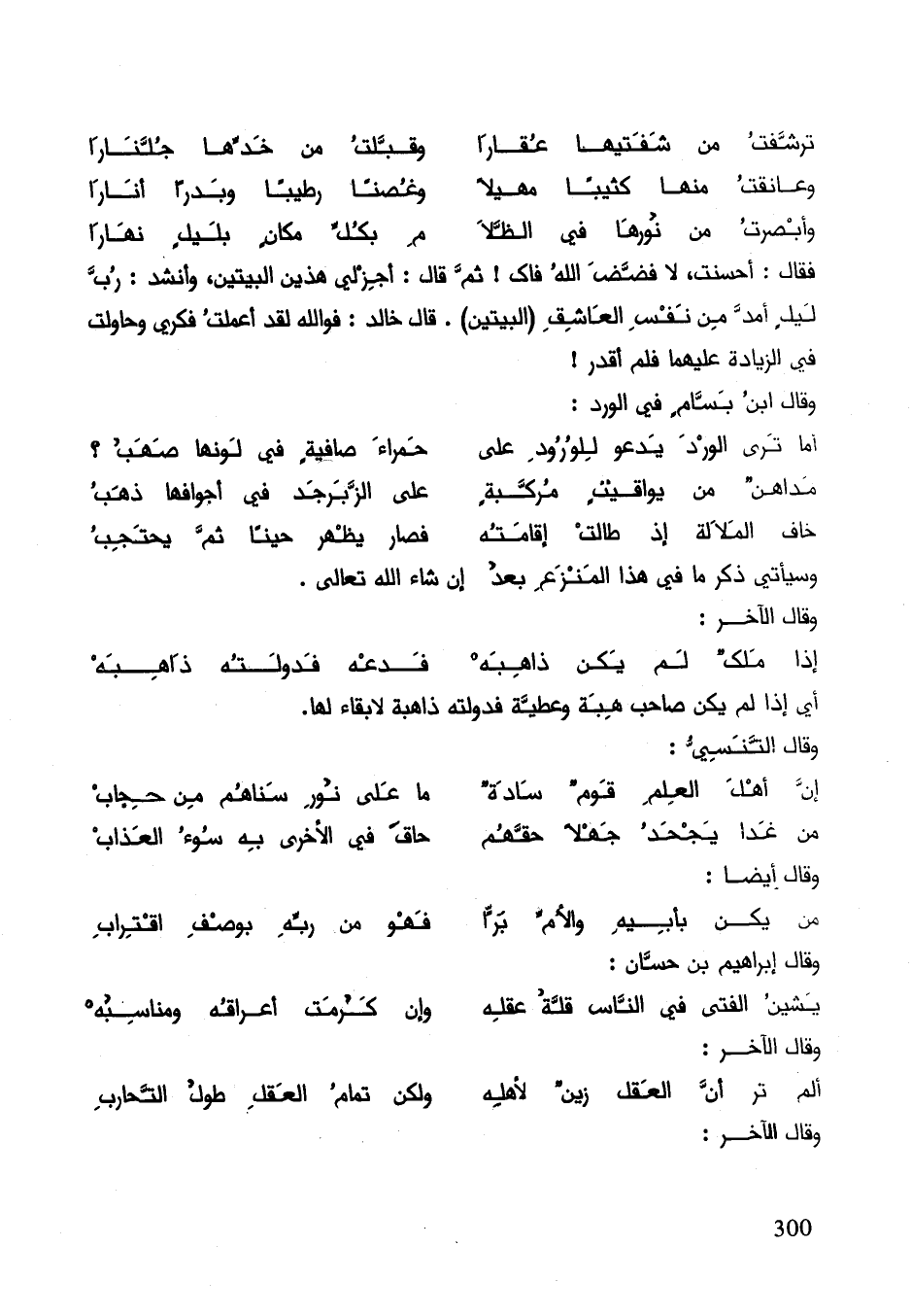 فقال: أحسنت لا فضض الله فاك! ثم قال: أجزاي هذين البيتين وأنشد: ربَّ ليلٍ أمد من نفس العاشق البيتين. قال خالد: فو الله لقد أعملت فكري وحاولت في الزيادة عليها فلم أقدر! وقال أبن بسام الورد: