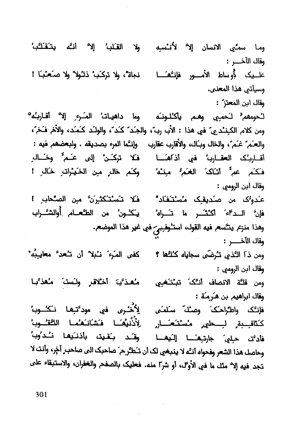 وحاصل هذا الشعر وفحواه أنه لا ينبغي لك أن تطرح صاحبك إلى صاحب آخر وأنت تجد فيه إلاّ مثل ما في الأول أو شراً منه. فعليك بالصفح والغفران والاستبقاء على