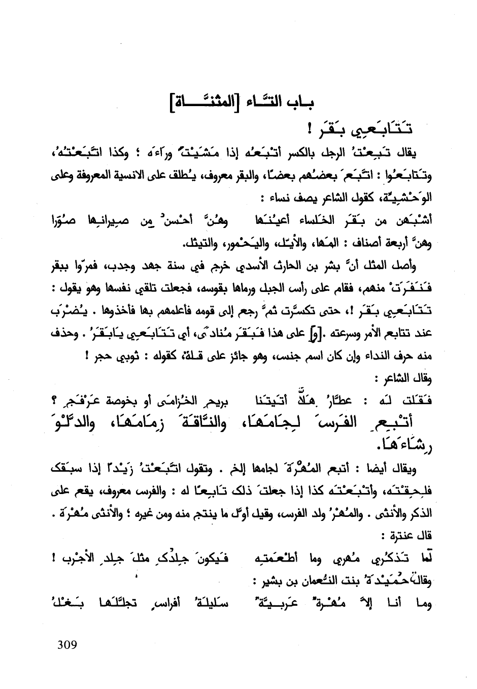 يقال بعت الرجل بالكسر أتبعه إذا مشيت وراءه؛ وكذا أتبعته، وتتابعوا: اتبع بعضهم بعضا، والبقر معروف يطلق على الإنسية المعروفة وعلى الوحشية، كقول الشاعر يصف نساء: