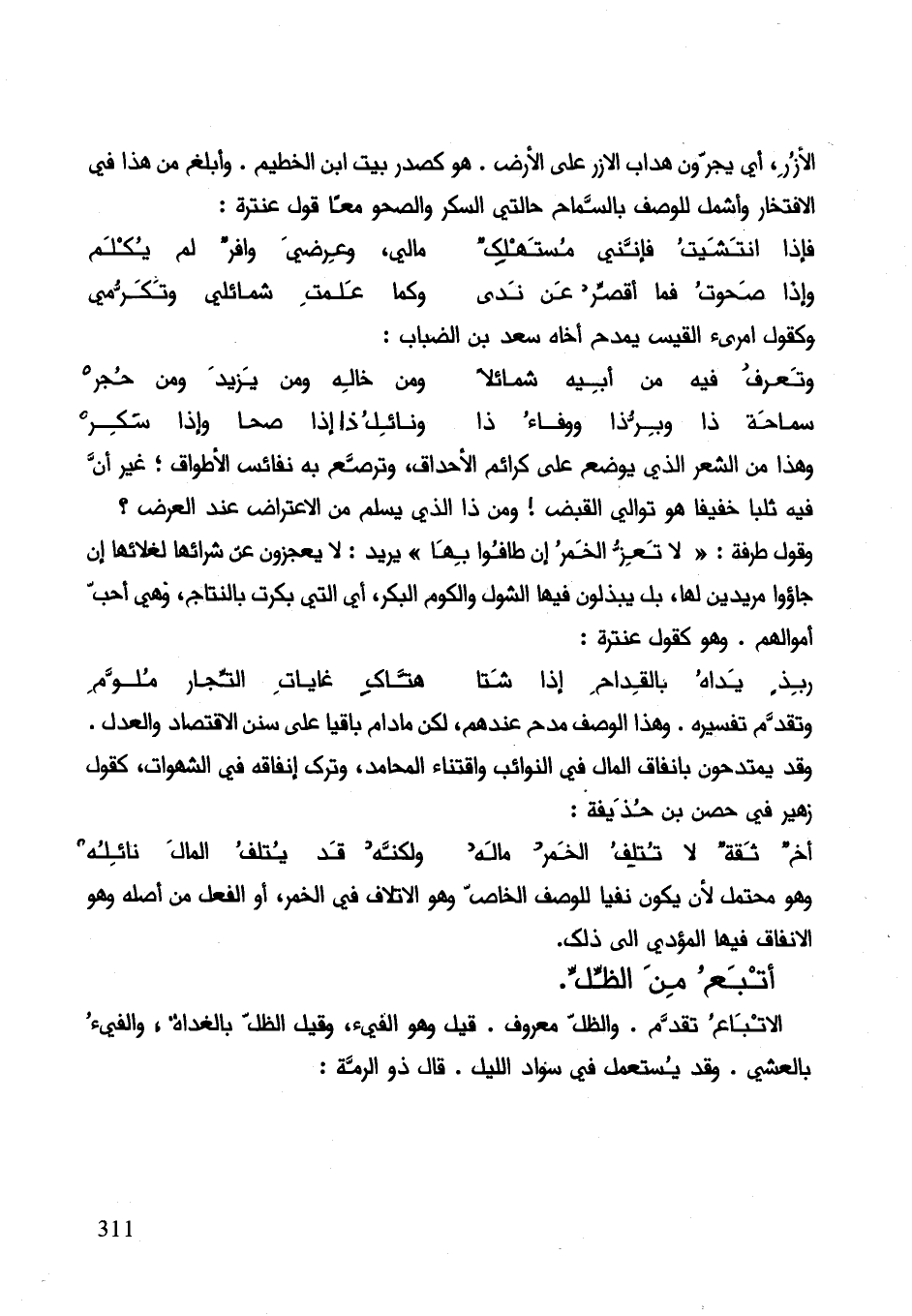 وهذا من الشعر الذي يوضع على كرائم الإحداق وترصع به نفائس الأطواق غير أن فيه ثلبا خفيفا هو توالي القبض! ومن ذا الذي يسلم من الاعتراض عند العرض؟ وقول طرفة " لا تعز الخمر إن طافوا بها " يريد: لا يعجزون عن شرائها لغلائها إنَّ جاءوا مريدين لها بل يبذلون فيها الشول والكوم البكر أي التي بكرت بالنتاج وهي احب أموالهم وهو كقول عنترة: