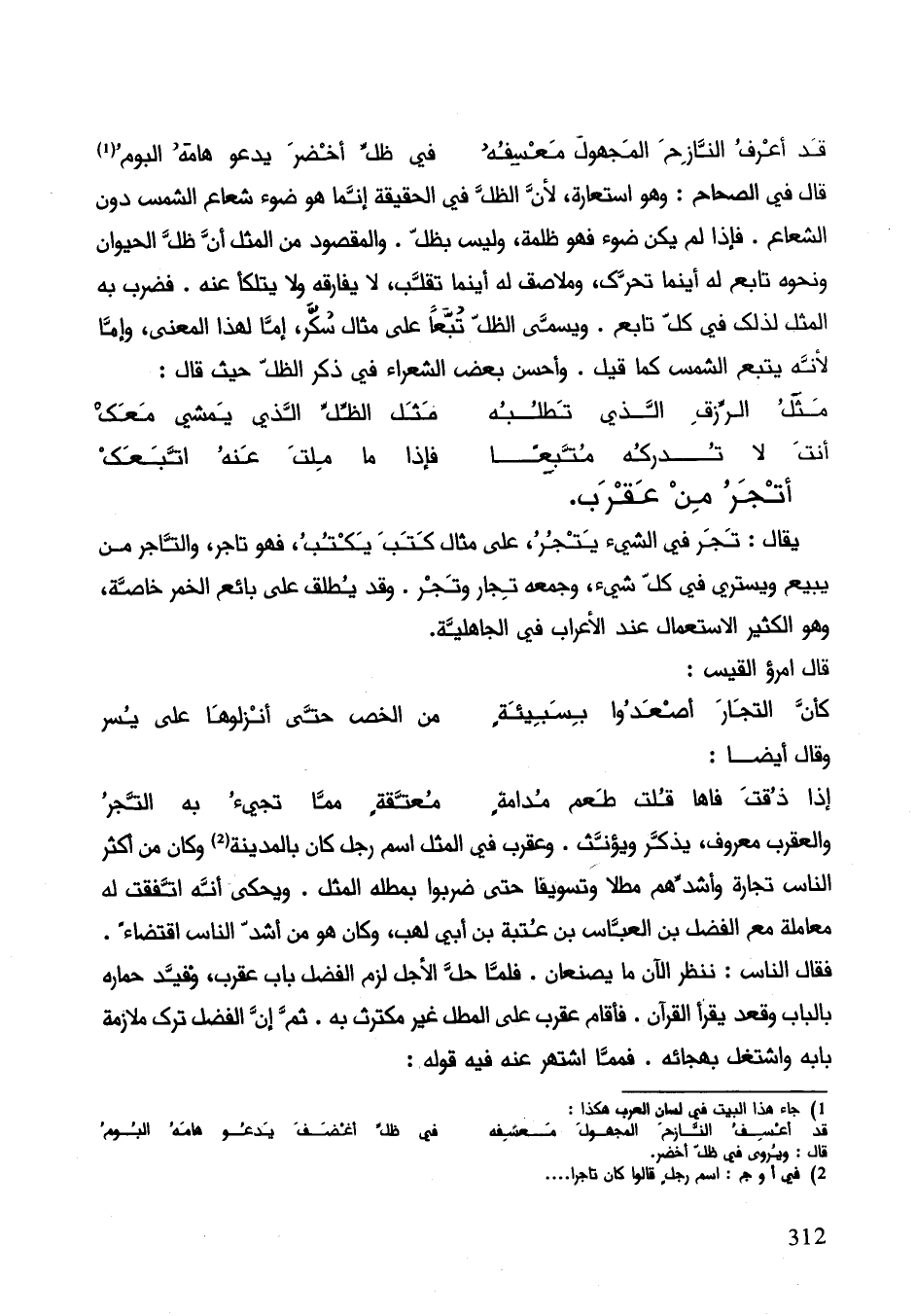 قال في الصحاح: وهو استعارة لأن الظل في الحقيق إنّما هو ضوء شعاع الشمس دون الشعاع. فإذا لم يكن ضوء فهو ظلمة وليس بظل. والمقصود من المثل إنَّ ظل الحيوان ونحوه تابع له أينما تحرك وملاصق له أينما تقلب لا يفارقه ولا يتلكأ عنه فضرب به المثل لذلك في كل تابع. ويسمى الظل تبعا على مثال سكر أما لهذا المعنى وأما لأنّه يتبع الشمس كما قيل. واحسن بعض الشعراء في ذكر الظل حيث قال: