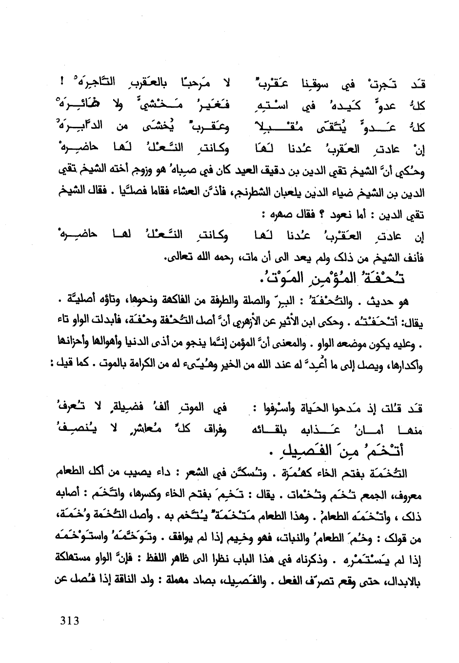 التخمة بفتح الخاء كهمزة وتسكن في الشعر: داء يصيب من أكل الطعام معروف الجمع تخم وتخمات. يقال: تخم بفتح الخاء وكسرها وأتخم: أصابه ذلك وأتخمه الطعام. وهذا الطعام متخمة يتخم به. وأصل التخمة وخمة من قولك: وخم الطعام والنبات فهو وخيم إذا لم يوافق. وتوخمه واستوخمه إذا لم يستمره. وذكرناه في هذا الباب نظرا إلى ظاهر اللفظ: فإنَ الواو مستهلكة بالإبدال حتى وقع تصرف الفعل. والفصيل، بصاد مهملة: ولد الناقة إذا فصل عن