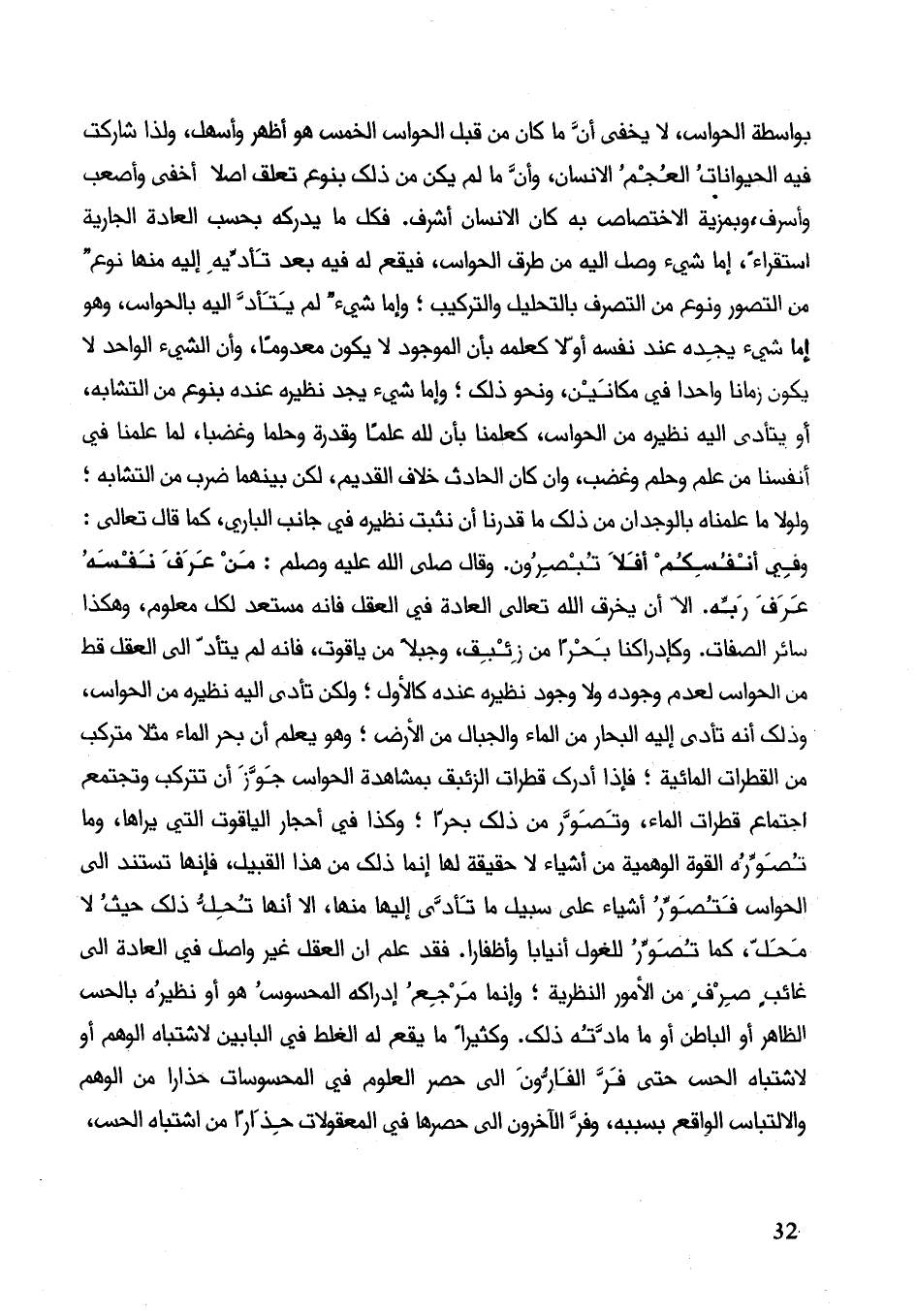 بواسطة الحواس، لا يخفى أن ما كان من قبل الحواس الخمس هو أظهر واسهل، ولذا شاركت فيه الحيوانات العجم والإنسان، وأن ما لم يكن من ذلك بنوع تعلق أصلا أخفى وأصعب وإسراف، وبمزية الاختصاص به كان الإنسان اشرف. فكل ما يدركه بحسب العادة الجارية استقراء، إما شيء وصل إليه من طرق الحواس، فيقع فيه بعد تأديه إليه منها نوع من التصور ونوع من التصرف بالتحليل والتركيب؛ وأما شيء يتأد إليه بالحواس، وهو إما شيء يجده عند نفسه أوّلاً كعلمه بان الموجود لا يكون معدوما، وأن الشيء الواحد لا يكون زمانا واحدا في مكانين، ونحو ذلك؛ وإما شيء يجد نظيره عنده بنوع من التشابه، أو يتأدى إليه نظيره من الحواس، كعلمنا بأن لله علما وقدرة وحلما وغضبا، لمّا علمنا في أنفسنا من علم وحلم وغضب، وإن كان الحادث خلاف قديم، لكن بينها ضرب من التشابه؛ ولولا ما علمناه بالوجدان من ذلك ما قدرنا أن نثبت نظيره في جانب الباري، كما قال تعالى:) وفي أنفسكم أفلا تبصرون. (وقال صلى الله عليه وسلم: " من عرف نفسه عرف ربه ". إلاّ إن يخرق الله تعالى العادة في العقل فأنه مستعد لكل العلوم، وهكذا سائر الصفات. وكإدراكنا بحراً من الزئبق، وجبلا من الياقوت، فانه لم يتأد إلى العقل قط من الحواس لعدم وجوده ولا وجود نظيره عنده كالأول؛ ولكن تأدى إليه نظير من الحواس، وكذلك إنّه تأدى إليه البحار من الماء والجبال من الأرض؛ وهو يعلم إنّ بحر الماء مثلا متركب من القطرات المائية؛ فإذا أدرك قطرات الزئبق بمشاهدة الحواس جوز أن تتركب وتتجمع اجتماع قطرات الماء، وتصور من ذلك بحراً؛ وكذلك في أحجار الياقوت التي يراها، وما تصوره القوة الوهمية من أشياء لا حقيقة لها إنما ذلك من هذا القبيل، فإنها تستند إلى الحواس فتصور أشياء عل سبيل ما تأدى إليها منها، إلا إنها تحل ذلك حيث لا محل، كما تصور للغول أنيبا وأظفارا. فقد علم إن العقل غير واصل في العادة إلى غائب صرف من الأمور النظرية؛ وإنما مرجع إدراكه المحسوس هو أو نظيره بالحس الظاهر أو الباطن أو ما مادته ذلك. وكثيراً ما يقع له الغلط في البابين لاشتباه الوهم أو لاشتباه الحس حتى فر الفارون إلى حصر العلوم في المحسوسات حذاراً من الوهم والالتباس الوقع بسببه، وفر الآخرون إلى حصرها في المعقولات حذاراً من اشتباه الحس،