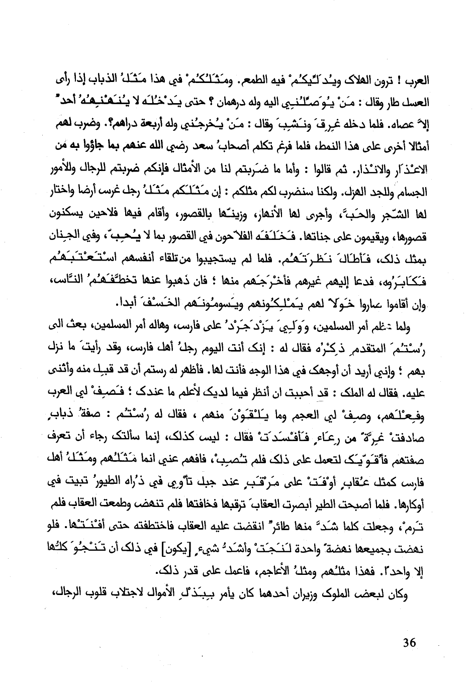 العرب! ترون الهلاك ويدليكم فيه الطمع. ومثلكم في هذا مثل الذباب إذا رأى العسل طار وقال: " من يوصيني إليه وله درهمان؟ حتى يدخلنه لا ينهنهه أحد " إلا عصاه. فلما دخله غرق ونشب وقال يخرجني وله أربعة دراهم؟. وضرب لهم امثلاً أخرى على هذا النمط، فلما فرغ تكلم سعد رضي الله عنهم بما جاءوا به من الأعذار والإنذار. ثم قالوا: وإما ما ضربتم لنا من الأمثال فإنكم ضربتم للرجال وللأمور الجسام وللجد والهزل. ولكنا سنضرب لكم مثلكم: إنّ مثلكم مثل رجل غرس أرضا واختار لها الشجر والحب، وأجرى لها الأنهار، وزينها بالقصور، وأقام فيها فلاحين يسكنون قصورها، ويقيمون على جناتها. فخلفه الفلاحون في القصور بما لا يحب، وفي الجنان بمثل ذلك، فأطال نظرتهم. فلما لم يستجيبوا من تلقاء أنفسهم استعتبهم فكابروه، فدعا إليهم غيرهم فأخرجهم منها؛ فان ذهبوا عنها تخطفهم الناس، وإن أقاموا صاروا خولا لهم يملكونهم ويسومونهم الخسف أبداً.
