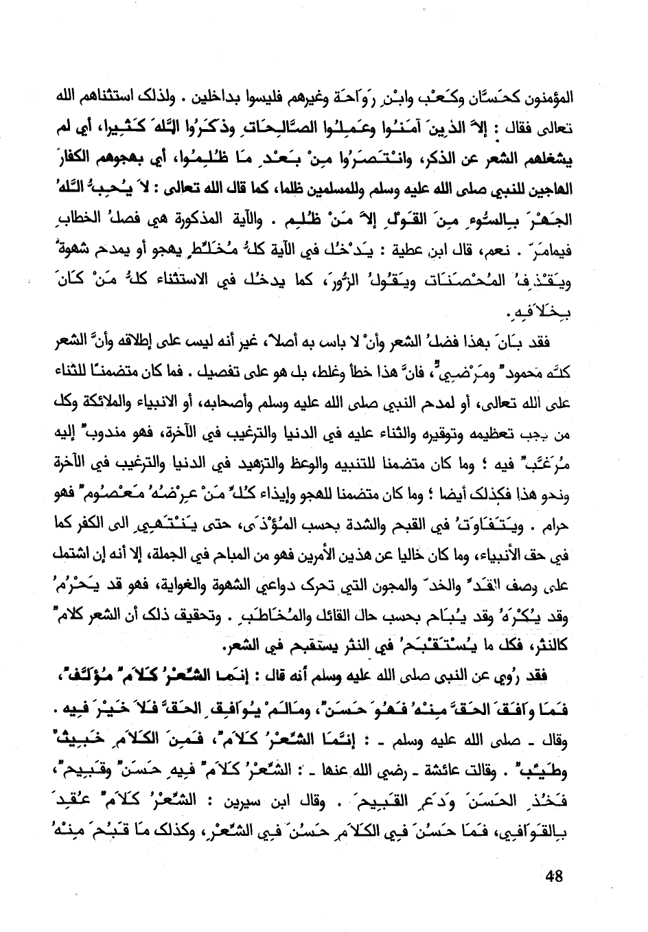 فقد بان بهذا فضل الشعر وأن لا باس به أصلا، غير إنّه ليس على إطلاقه وأن الشعر كله محمود ومرضي، فان هذا خطأ وغلط، بل هو على تفصيل. فما كان متضمنا للثناء على الله تعالى، أو لمدح النبي صلى الله عليه وسلم وأصحابه، أو الأنبياء والملائكة وكل من يجب تعظيمه وتوقيره والثناء عليه في الدنيا والترغيب في الآخرة، فهو مندوب إليه مرغوب فيه؛ وما كان متضمنا للتنبيه والوعظ والتزهيد في الدنيا والترغيب في الآخرة ونحو هذا فكذلك أيضاً؛ وما كان متضمنا للهجو وإيذاء كل من عرضه معصوم فهو حرام. ويتفاوت في القبح والشدة بحسب المؤذي، حتى ينتهي إلى الكفر كما في حق الأنبياء، وما كان خاليا عن هذين الأمرين فهو من المباح في الجملة، إلاّ أنه إن اشتمل على وصف القد والخد والمجون التي تحرك دواعي الشهوة والغواية، فهو قد يجرم وقد يكره وقد يباح بحسب حال القئل والمخاطب. وتحقيق ذلك أن الشعر كلام كالنثر، فكل ما يستقبح في النثر يستقبح في الشعر.