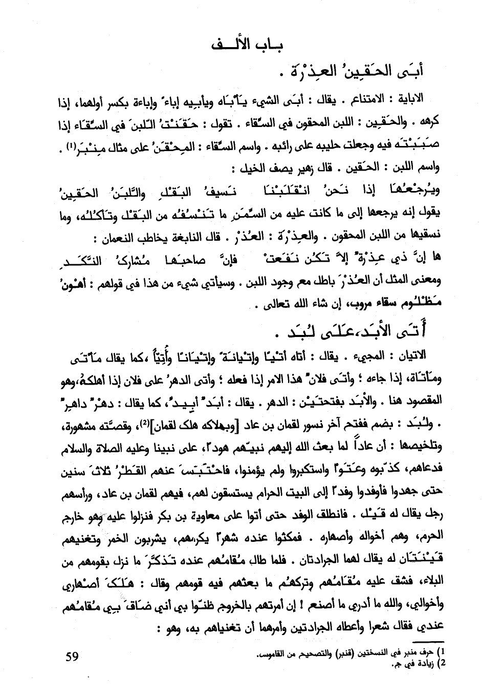 الإتيان: المجيء. يقال: أتاه أتيا وإتيانه وإتيانا وأتيا، كما يقال مأتى ومأتاه، إذا جاءه؛ وأتى فلان هذا الأمر إذا فعله؛ وأتى الدهر على فلان إذا أهلكه، وهو المقصود هنا. والأبد بفتحتين: الدهر. يقال: أبد أبيد، كما يقال: دهر داهر. ولبد: بضم ففتح آخر نسور لقمان بن عاد وبهلاكه هلك لقمان، وقصته مشهورة، وتلخيصها: إنّ عادا لمّا بعث الله إليهم نبيهم هودا، على نبينا وعليه الصلاة والسلام، فدعاهم، كذبوه وعتوا واستكبروا ولم يأمنوا، فاحتبس عنهم القطر ثلاث سنين حتى جهدوا فأوفدوا وفدا إلى البيت الحرام يستسقون لهم، فيهم لقمان بن عاد، ورأسهم رجل يقال له قيل. فانطلق الوفد حتى أتوا على معاوية بن بكر فنزلوا عليه وهو خارج الحرم، وهم أخواله وأصهاره. فمكثوا عنده شهرا يكرمهم، يشربون الخمر وتغنيهم قينتان له يقال لهما الجرادتان. فلما طال مقامهم عنده تذكر ما نزل بقومهم من البلاء، فشق عليه مقامهم وتركهم ما بعثهم فيه قومهم وقال: هلك أصهاري وأخوالي، والله ما أدري ما أصنع! إن أمرتهم بالخروج ظنوا بي إني ضاق بي مقامهم عندي فقال شعرا وأعطاه الجرادتين وأمرها أن تغنياهم به، وهو: