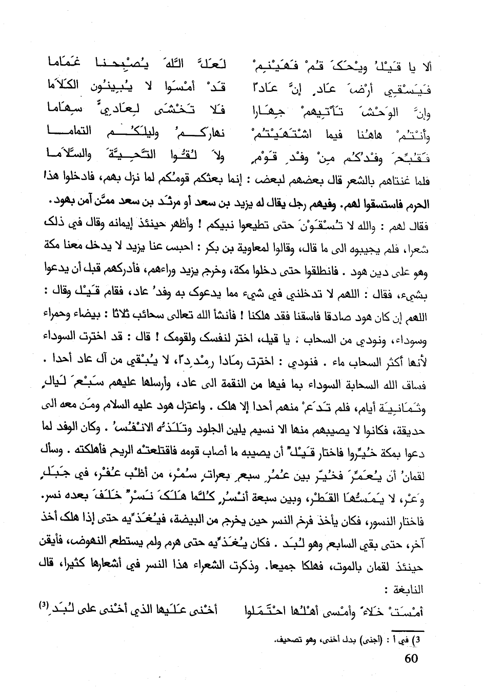 فأما غناهم بالشعر قال بعضهم لبعض: إنّما بعثكم قومكم لمّا نزل بهم، فادخلوا هذا الحرم فاستسقوا لهم. وفيهم رجل يقال له يزيد بن سعد أو مرثد بن سعد ممن آمن بهود. فقال لهم: والله لا تسقون حتى تطيعوا نبيكم! وأظهر حينئذ إيمانه وقال في ذلك شعرا، فلم يجيبوه إلى ما قال، وقالوا لمعاوية بن بكر: احبس عنا يزيد لا يدخل معنا مكة وهو على دين هود. فانطلقوا حتى دخلوا مكة، وخرج يزيد وراءهم، فأدركهم قبل أن يدعوا بشيء، فقال: اللهم لا تدخلني في شيء مما يدعوك به وفد عاد، فقام قيل وقال: اللهم إن كان هود صادقا فاسقنا فقد هلكنا! فإنشاء الله تعالى سحائب ثلاثا: بيضاء وحمراء وسوداء، ونودي من السحاب. يا قيل، اختر لنفسك ولقومك! قال: قد اخترت السوداء لأنها اكثر السحاب ماء. فنودي: اخترت رمادا رمددا، لا يبقي من آل عاد أحدا. فساق الله السحابة السوداء بما فيها من النقمة إلى عاد، وأرسلها عليهم سبع ليال وثمانية أيام، فلم تدع منهم أحدا إلاّ هلك. واعتزل هود عليه السلام ومن معه إلى حديقة، فكانوا لا يصيبهم منها إلاّ نسيم يلين الجلود وتلذه الأنفس. وكان الوفد لمّا دعوا بمكة خيروا فأختار قيل أن يصيبه ما أصاب قومه فاقتلعته الريح فأهلكته. وسأل لقمان أن يعمر فخير بين عمر سبع بعرات سمر، من أظب عفر، في جبل وعر، لا يمسها القطر، وبين سبعة أنسر كلما هلك نسر خلف بعده نسر. فأختار النسور. فكان يأخذ فرخ النسر حين يخرج من البيضة، فيغذيه حتى إذا هلك أخذ آخر، حتى بقي السابع وهو لبد. فكان يغذيه حتى هرم ولم يستطع النهوض، فأيقن حينئذ لقمان بالموت، فهلكا جميعا. وذكرت الشعراء هذا النسر في أشعارها كثيرا، قال النابغة: