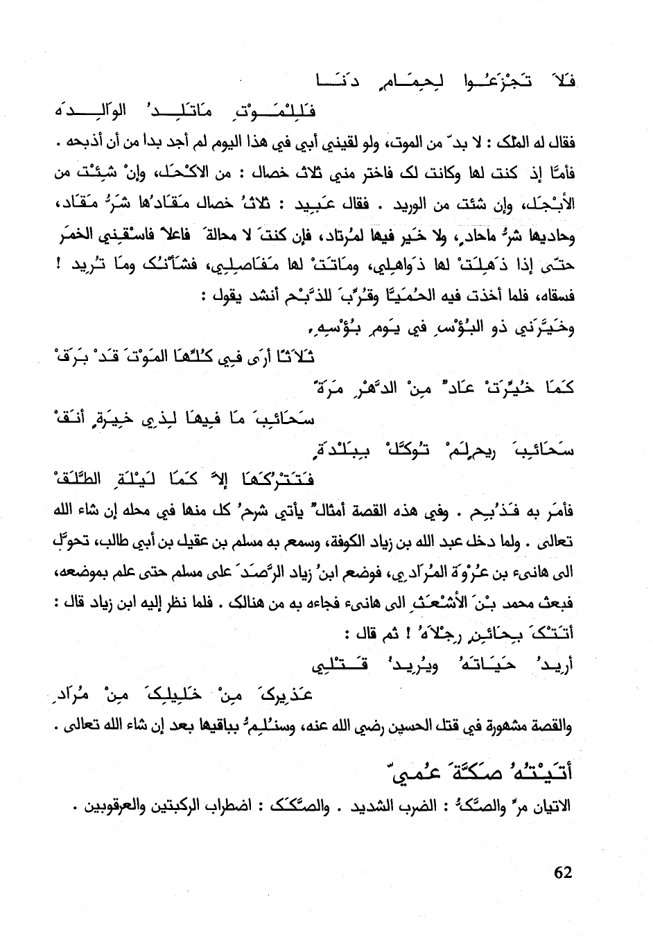فقال له الملك: لا بد من الموت ولو لقيني أبي في هذا اليوم لم أجد بداً من أن اذبحه. فأما إذ كنت لها وكانت لك فأختر مني ثلاث خصال: من الأكحل، وإنّ شئت من الأبجل، وإنّ شئت من الوريد. فقال عبيد: ثلاث خصال مقادها شر مقاد، وحاديها شر محاد، ولا خير فيها لمرتاد، فإن كنت لا محالة فاعلاً فأستقي الخمر حتى إذا ذهلت لها ذواهلي، وماتت لها مفاصلي فشأنك وما تريد! فسقاه، فلما أخذت فيه الحميا وقرب الذبح أنشد يقول: