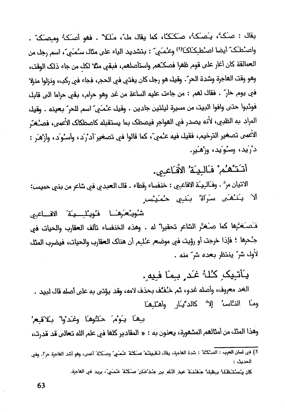 يقال: صكَّ، يصكُّ، صككّا، كما يقال مل، مللا. فهو أصك ومصك. واصطك أيضاً اصطكاكا وعمي: بتشديد الياء على مثال سمي، اسم رجل من العمالقة كان أغار على قوم ظهراً فصكهم واستأصلهم، وبقي مثالاً لكل من جاء ذلك الوقت، وهو الهاجرة وشدة الحر. وقيل هو رجل كان يفتي في الحجم، فجاء في ركب، ونزلوا منزلاً في يوم حار. فقال لهم: من جاءت عليه الساعة من غد وهو حرام، بقي حرام إلى قابل فوثبوا حتى وافوا البيت من مسيرة ليلتين جادين. وقيل عمي اسم للحر بعينه. وقيل المراد به الظبي، لأنّه يصدر في الهواجر فيصطك بما يستقبله كاصطكاكا الأعمى، فصغر الأعمى تصغير الترخيم، فيه عمي، كما قالوا في تصغير أدرد، وأسود، وأزهر: دريد، وسويد، وزهير.