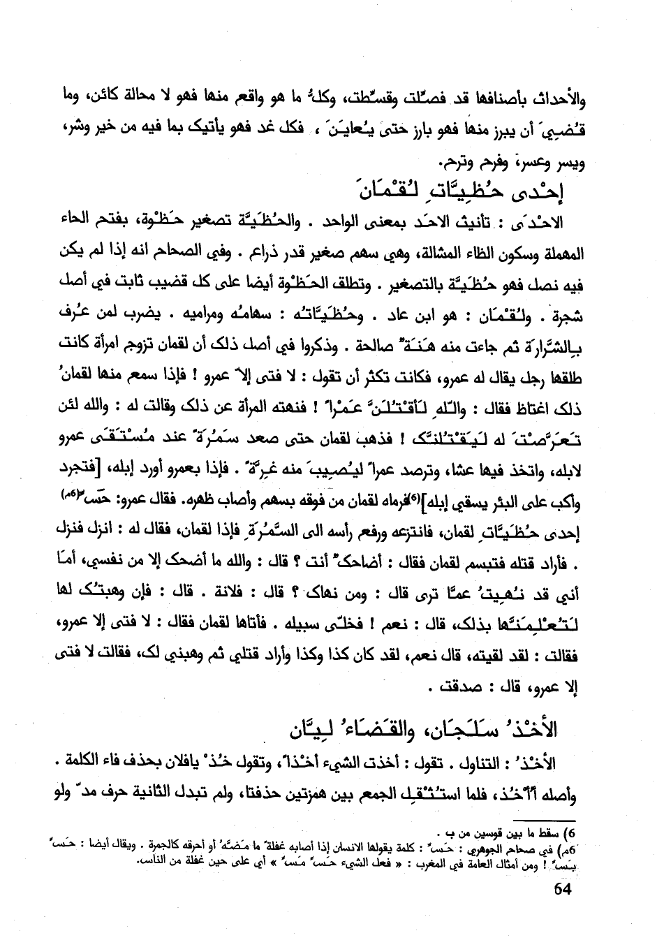 الإحدى: تأنيث الأحد بمعنى الواحد. والحظية تصغير حظوة، بفتح الحاء المهملة وسكون الظاء المشالة، وهي سهم صغير قدر ذراع. وفي الصحاح إنّه إذا لم يكن فيه نصل فهو حظية بالتصغير. وتطلق الحظوة أيضاً على كل قضيب تابت في أصل شجرة. ولقمان: هو أبن عاد. وحظياته: سهامه ومراميه. يضرب بمن عرف بالشرارة ثم جاءت منه هنة صالحة. وذكروا في أصل ذلك أن لقمان تزوج امرأة كانت طلقها رجل يقال له عمرو، فكانت تكثر أن تقول: لا فتى إلاّ عمرو! فإذا سمع منها لقمان ذلك اغتاظ فقال: والله لأقتلن عمرا! فنهته المرأة عن ذلك وقالت له: والله لأن تعرضت له ليقتلنك! فذهب لقمان حتى صعد سمرة عند مستقى عمرو لإبله، واتخذ فيها عشا، وترصد عمرا ليصيب منه غرة. فإذا بعمرو أورد إبله، فتجرد وأكب على البئر يسقي إبله فرماه لقمان من فوقه بسهم وأصاب ظهره. فقال عمرو: حس إحدى لقمان، فانتزعه ورفع رأسه إلى السمرة فإذا لقمان، فقال له: أنزل فنزل فأراد قتله فتبسم لقمان فقال: أضاحك أنت؟ قال: والله ما أضحك إلى من نفسي، أما إني قد نهيت عما ترى قال: ومن نهاك؟ قال: فلانة. قال: فإن وهبتك لها لتعلمنها بذلك، قال: نعم! فخلى سبيله. فأتاها لقمان فقال: لا فتى إلاّ عمرو، فقلت: لقد لقيته، قال نعم، لقد كان كذا وكذا وأراد قتلي ثم وهبني لك، فقالت لا فتى إلاّ عمرو، قال: صدقت.