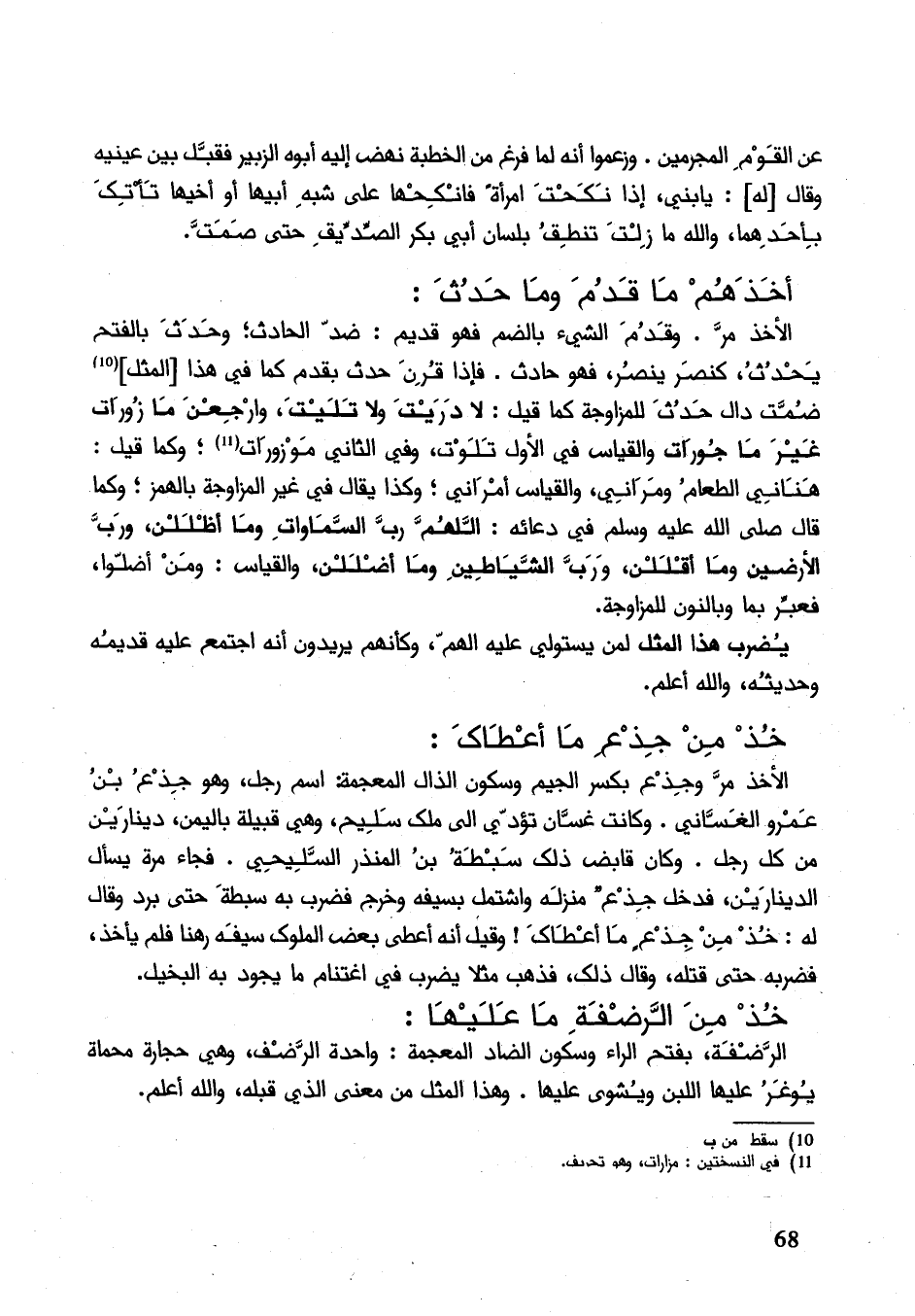 الأخذ مر. وقدم الشيء بالضم فهو قديم: ضد الحادث؛ بالفتح يحدث، كنصر ينصر، فهو حادث. فإذا قرن حدث بقدم كما في هذا المثل ضمت دال حدث للمزاوجة كما قيل: لا دريت ولا تليت، وأرجعن ما زورات غير ما جورات والقياس في الأول تلوت، وفي الثاني موزورات؛ وكما قيل: هناني الطعام ومراني، والقياس أمراني؛ وكذا يقال في غير المزاوجة بالهمز؛ وكما قال صلى الله عليه وسلم في دعائه: اللهم رب السماوات وما أظللن، ورب الأرضين وما أقللن، ورب الشياطين وما أضللن، والقياس: ومن أضلوا، فعبر بما والنون للمزاوجة.