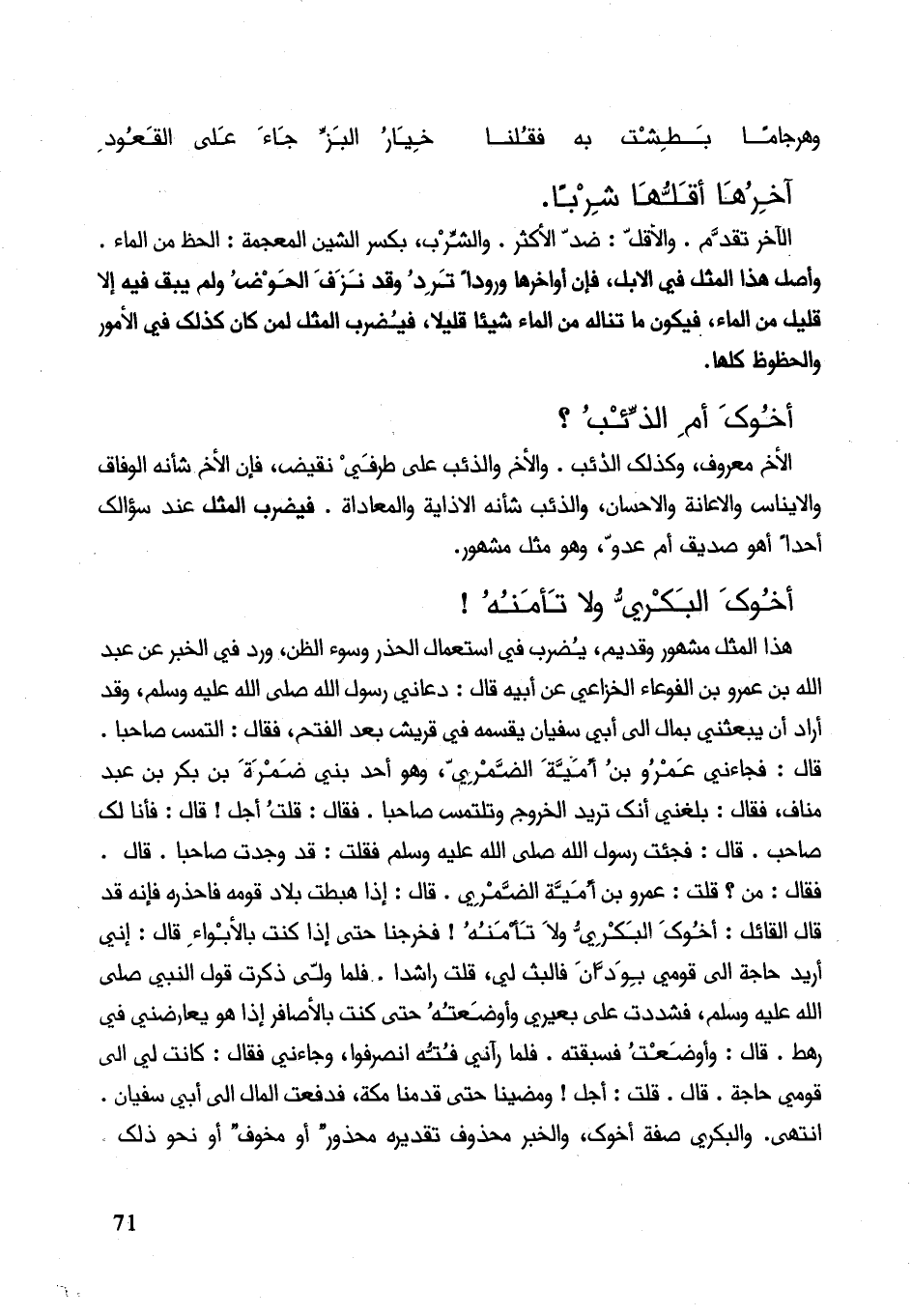 هذا المثل مشهور وقديم، يضرب في استعمال الحذر وسوء الظن، ورد في الخبر عن عبد الله بن عمرو بن الفوعاء الخزاعي عن أبيه قال: دعاني رسول الله صلى الله عليه وسلم، وقد أراد أن يبعثني بمال إلى أبي سفيان يقسمه في قريش بعد الفتح، فقال: التمس صاحبا. قال: فجائني عمرو بن أمية الضمري، وهو أحد بني ضمرة بن بكر بن عبد مناف، فقال: بلغني أنك تريد الخروج وتاتمس صاحبا. فقال: قلت أجل! قال: فأنا لك صاحب. قال: فجئت رسول الله صلى الله عليه وسلم فقلت: قد وجدت صاحبا. قال. فقال: من؟ قلت: عمرو بن أمية الضمري. قال: إذا هبطت بلاد قومه فأحذره فإنه قد قال القائل: أخوك البكري ولا تأمنه! فخرجنا حتى إذا كنت بالأبواء قال: إني أريد حاجة إلى قومي بودان فالبث لي، قلت راشد. فلما ولى ذكرت قول النبي صلى الله عليه وسلم، فشددت على بعيري وأوضعته حتى كنت بالأصفار إذا هو يعرضني في رهط. قال: وأوضعت فسبقته. فلما رأني فته انصرفوا، وجاءني فقال: كانت لي إلى قومي حاجة. قال. قلت: أجل! ومضينا حتى مكة، فدفعت المال إلى أبي سفيان. انتهى. والبكري صفة أخوك، والخبر محذوف تقديره " أو مخوف " أو نحو ذلك