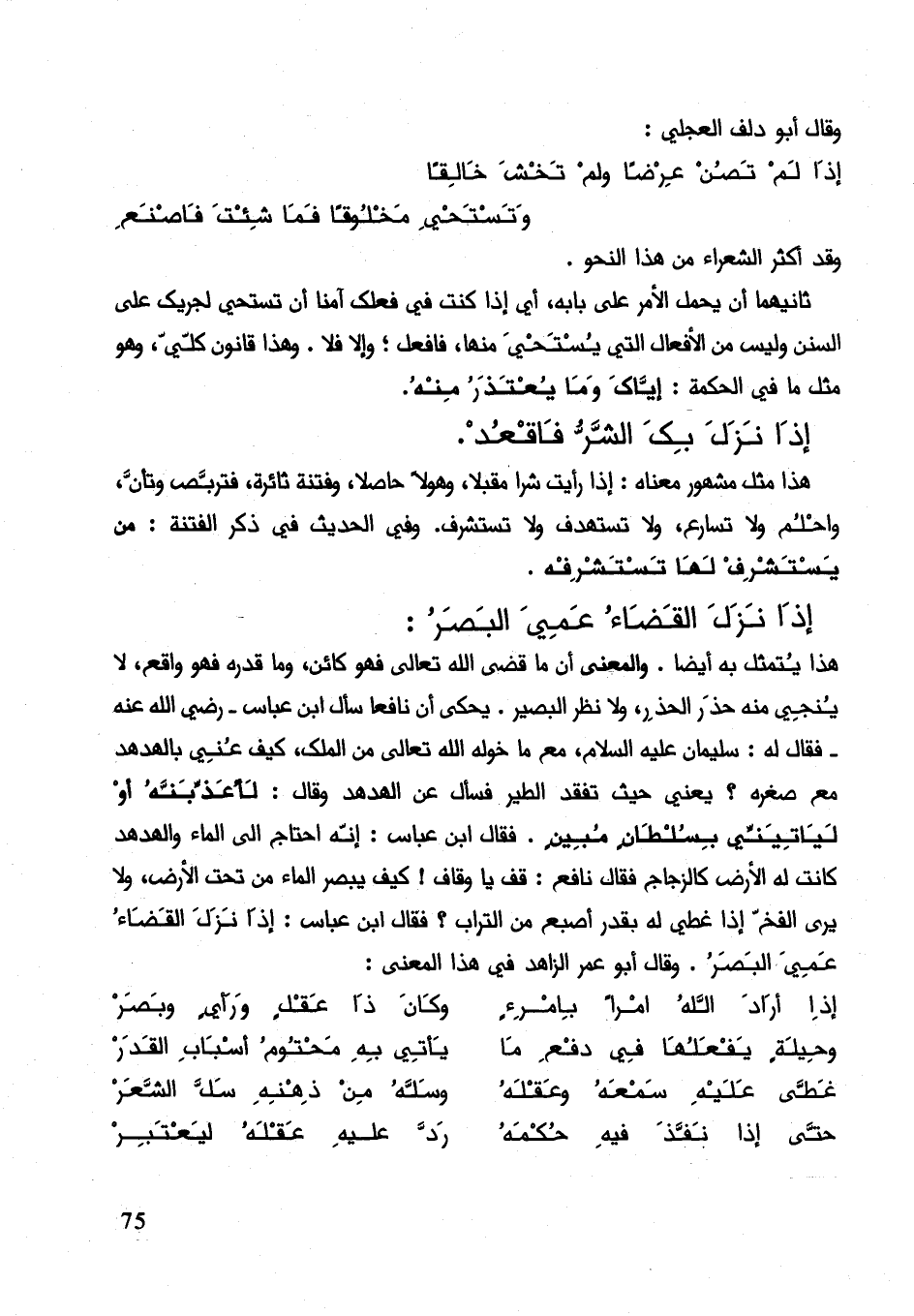 هذا يتمثل به أيضاً. والمعنى أن ما قضى الله تعالى فهو كائن، وما قدره فهو واقع، لا ينجي منه الحذر، ولا نظر البصير. يحكى أن نافعا سأل أبن عباس - رضي الله عنه - فقال له: سليمان عليه السلام، مع ما خوله الله تعالى من الملك، كيف عني بالهدهد مع صغره؟ يعني حيث تفقد الطير فسأل عن الهدهد وقال: لأعذبنه أو ليأتيني بسلطان مبين. فقال أبن عباس: إنه احتاج إلى الماء والهدهد كانت له الأرض كالزجاج فقال نافع: قف يا وقاف! كيف يبصر الماء من تحت الأرض، ولا يرى الفخ إذا عطي له بقد إصبع من التراب؟ فقال أبن عباس: إذا نزل القضاء عمي البصر. وقال أبو عمر الزاهد في هذا المعنى: