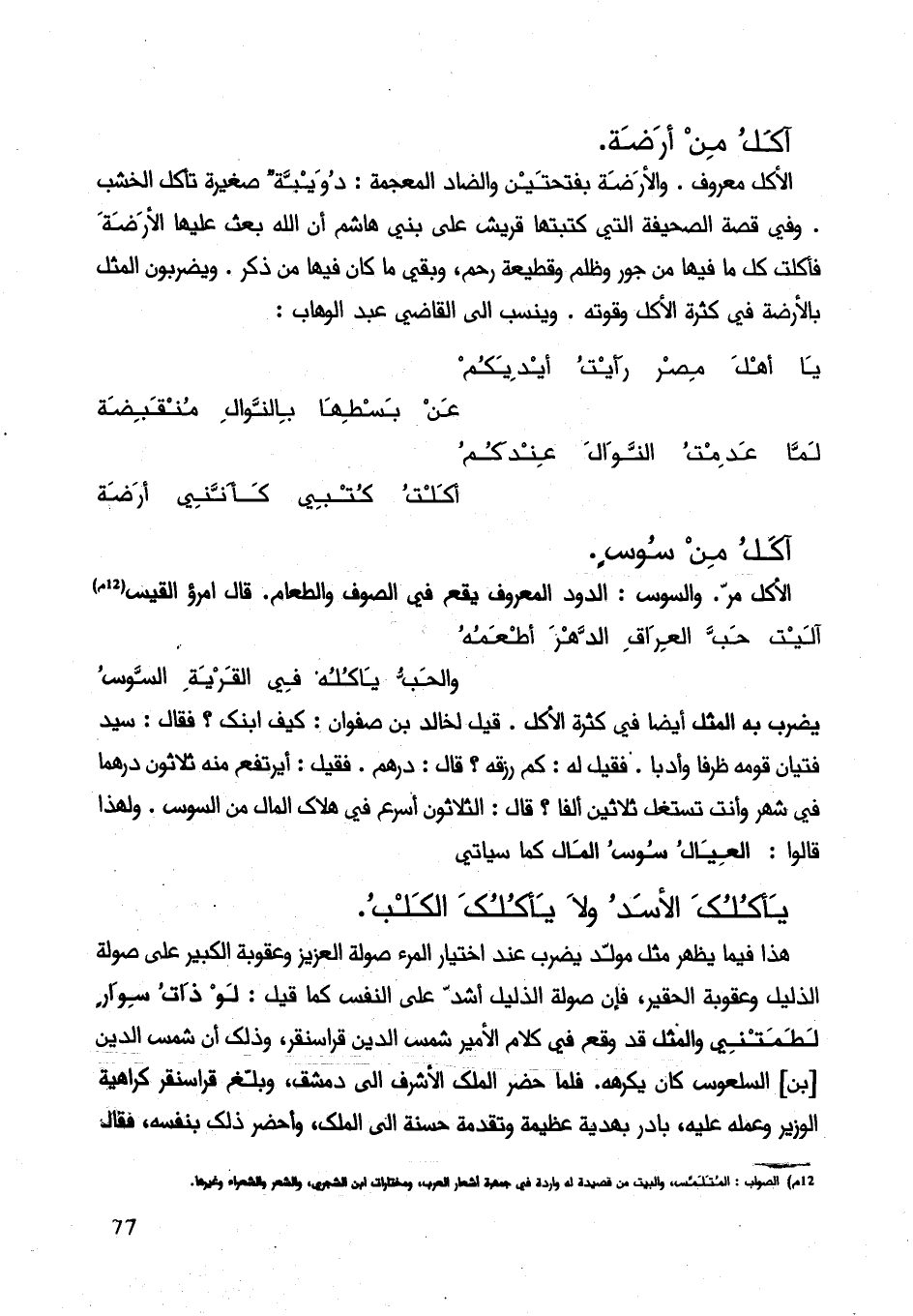 الأكل معروف. والأرضة بفتحتين والضاد المعجمة: دويبة صغيرة تأكل الخشب وفي قصة الصحيفة التي كتبتها قريش على بني هاشم أ، الله بعث عليها الأرضة فأكلت كل ما فيها من جور وظلم ز قطيعة رحم، وبقي ما كان فيها من ذكر. ويضربون المثل بالأرضة في كثرة الأكل وقوته. وينسب إلى القاضي عبد البوهاب: