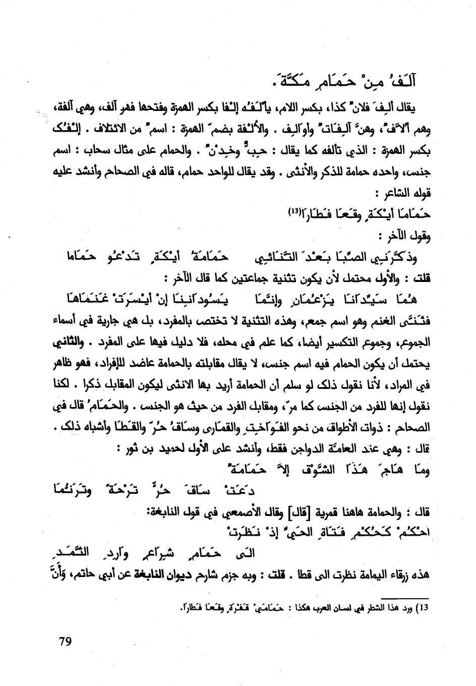 يقال ألِفَ فلان كذا، بكسر اللام، يألفه إلفاً بكسر الهمزة وفتحها فهو ألف، وهي آلفة، وهم آلاف، وهن آلفات وأو ألف. والألفة بضم الهمزة: اسم من الائتلاف. إلفك بكسر الهمزة: الذي تألفه كما يقال: حب وخدن. والحمام على مثال سحاب: اسم جنس واحدة حمامة للذكر والأنثى. وقد يقال للواحد حمام، قاله في الصحاح وأنشد عليه قوله الشاعر: