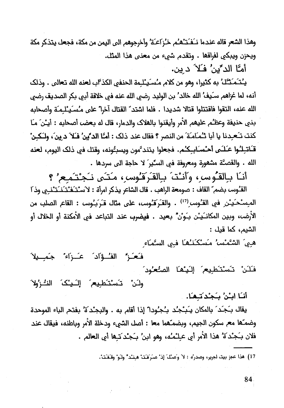 يتمثل به كثيرا، وهو كلام مسيلمة الحنفي الكذاب لعنه الله تعالى. وذلك أنه، لمّا غزاهم سيف الله خالد بن الوليد رضي الله عنه في خلافة أبي بكر الصديق رضي الله عنه، التقوا فاقتتلوا قتالا شديدا. فلما اشتد القتال آخرا على مسيلمة وأصحابه بني حنيفة وعظم عليهم الأمر وأيقنوا بالهلاك والدمار قال له بعض أصحابه: أين ما كنت تعدنا يا أبا ثمامة من نصر؟ فقال عبد ذلك: أما الدين فلا دين، ولكن قاتلوا على أحسابكم. فجعلوا يتندمون ويسبونه، وقتل في ذلك اليوم، لعنه الله. والقصة مشهورة ومعروفة في السير لا حاجة إلى سردها.