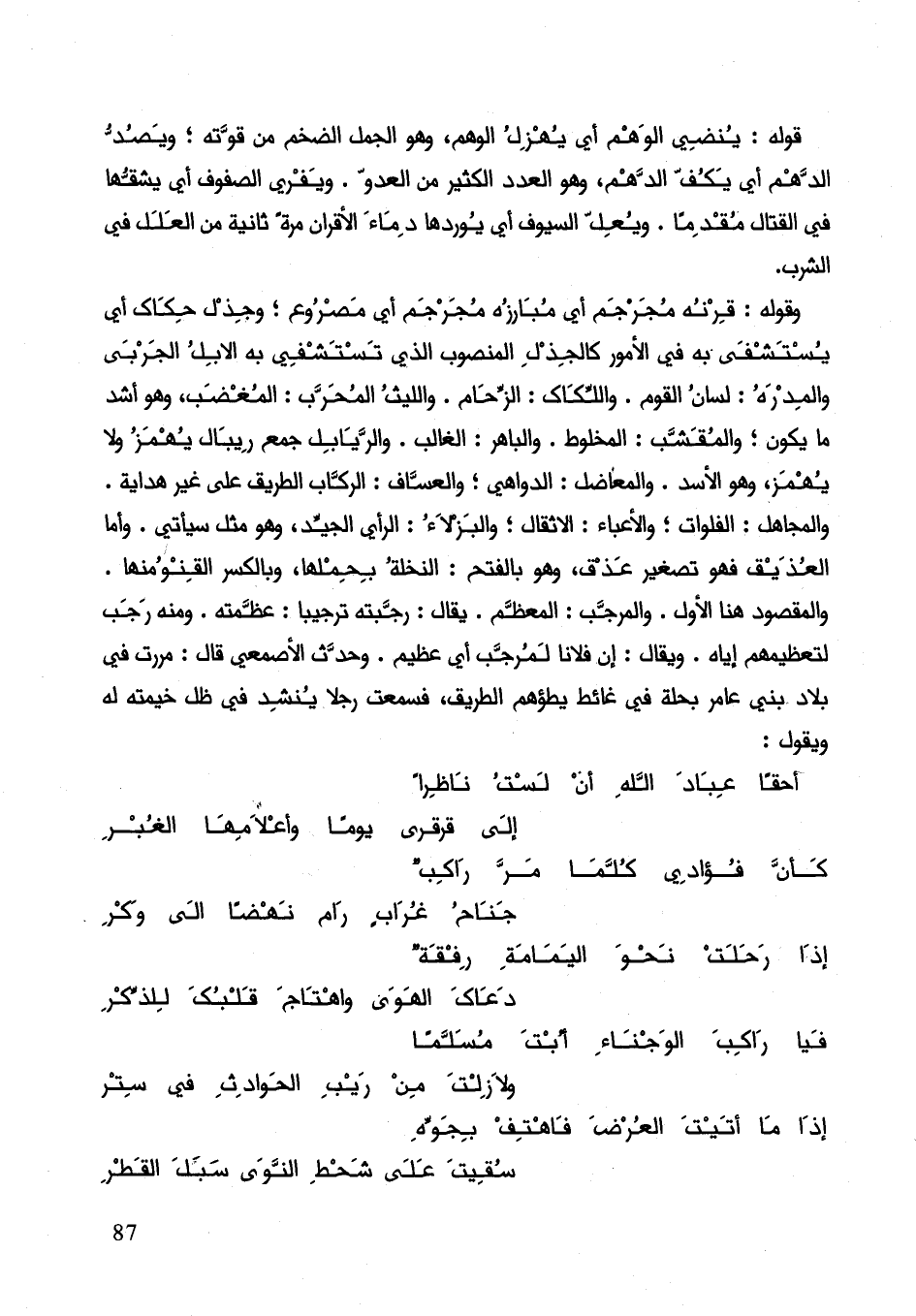 وقوله: قرنه مجرجم أي مبارزه مجرجم أي مصرع؛ وجذل حكاك أي يستشفي به في الأمور كالجذال المنصوب الذي يستشفي به الإبل الجربى والمدره: لسان القوم. واللكاك: الزحام. والليث المحرب: المغضب، وهو أشد ما يكون؛ والمقشب: المخلوط. والباهر: الغالب. واليابل جمع ريبال يهمز ولا يهمز، وهو الأسد. والمعاضل: الدواهي؛ والعساف: الركاب الطريق على غير هداية. والمجاهل: الفلوات؛ والأعباء: الأثقال؛ والبزلاء: الرأي الجيد، وهو مثل سيأتي. وأما العذيق فهو تصغير عذق، وهو بالفتح: النخلة بحملها، وبالكسر القنو منها. والمقصود هنا الأول. والمرجب: المعظم. يقال: رجبته ترجيبا: عظمته. ومنه رجب لتعظيمهم إياه. ويقال: إنّ فلان لمرجب أي عظيم. وحدث الأصمعي قال: مررت في بلاد بني عامر بحلة في غائط يطؤهم الطريق، فسمعت رجلا ينشد في ظل خيمته له ويقول: