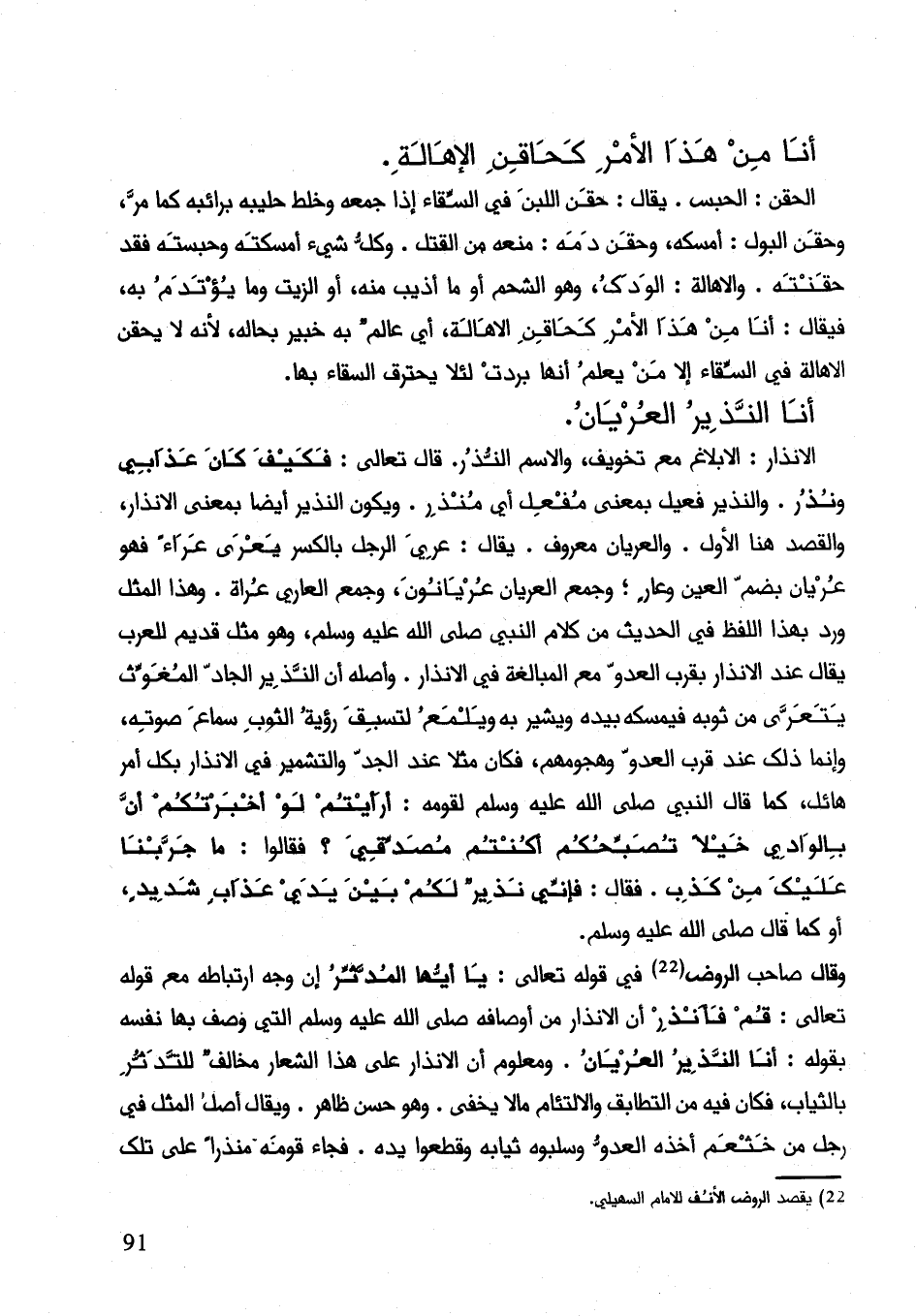 وقال صاحب الروض في قوله تعالى:) يا أيّها المدثرُ (إنّ وجه ارتباطه مع قوله تعالى:) قم فأنذر (أن الإنذار من أوصافه صلى الله عليه وسلم التي وصف بها نفسه بقوله: " أنا النذير العريان ". ومعلوم أن الإنذار على هذا الشعار مخالف للتدثر بالثياب، فكان فيه من التطابق والالتئام مالا يخفى. وهو حسن ظاهر. ويقال أصل المثل في رجل من خثعم أخذه العدو وسلبوه ثيابه وقطعوا يده. فجاء قومه منذراً على تلك