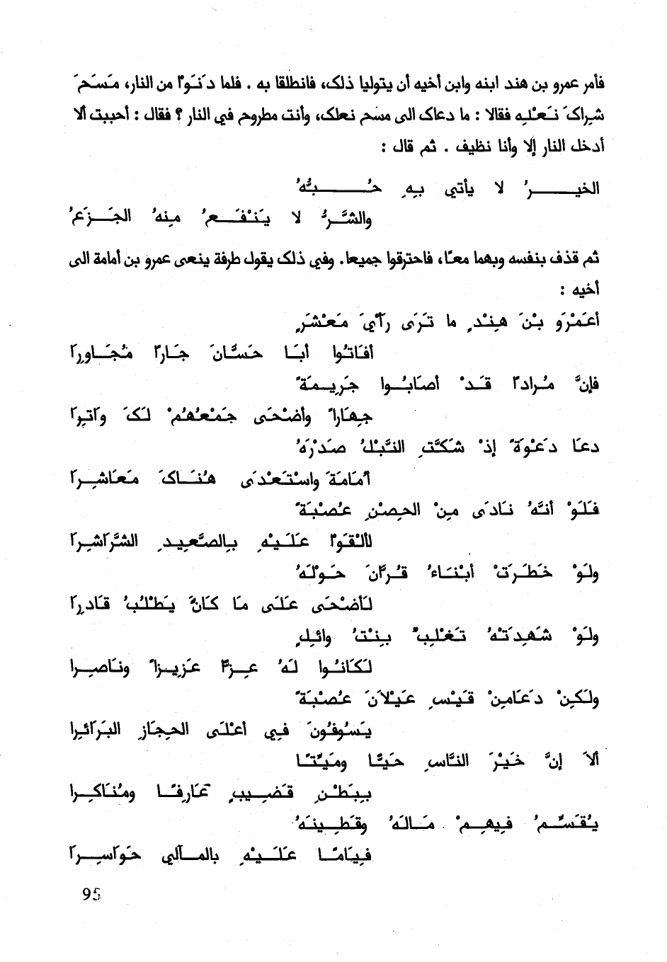 فأمر عمرو بن هند ابنه وأبن أخيه أن يتوليا ذلك، فانطلقا به. فلما دنوا من النار مسح شراك نعله فقالا: ما دعاك إلى مسح نعلك وأنت مطروح في النار؟ فقال: أحببت أن لا أدخل النار إلا وأنا نظيف. ثم قال: