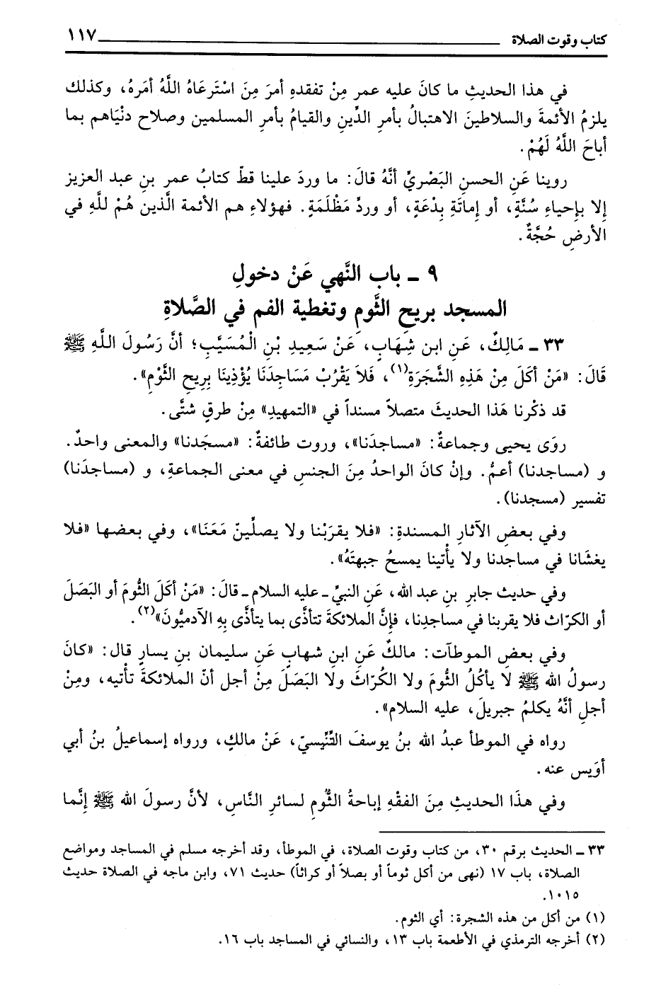 33 - مالك عن بن شِهَابٍ عَنْ سَعِيدِ بْنِ الْمُسَيَّبِ أَنَّ رَسُولَ الله صلى الله عليه وسلم قال ((من أَكَلَ مِنْ هَذِهِ الشَّجَرَةِ (1) فَلَا يَقْرَبْ مَسَاجِدَنَا يُؤْذِينَا بِرِيحِ الثَّوْمِ))