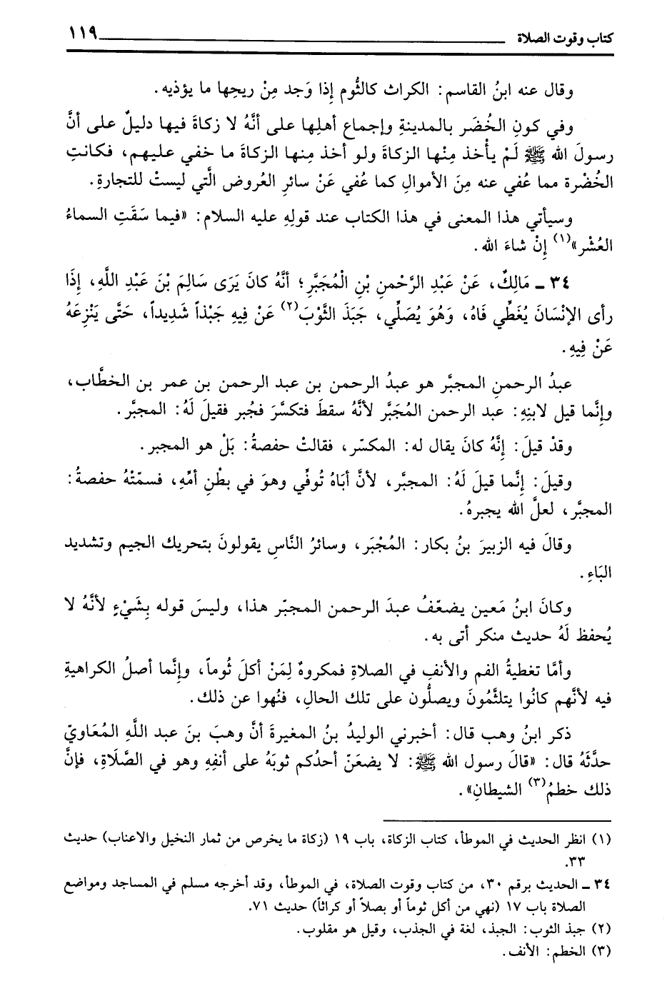 34 - مَالِكٌ عَنْ عَبْدِ الرَّحْمَنِ بْنِ الْمُجَبَّرِ أَنَّهُ كَانَ يَرَى سَالِمَ بْنَ عَبْدِ اللَّهِ إِذَا رَأَى الْإِنْسَانَ يُغَطِّي فَاهُ وَهُوَ يُصَلِّي جَبَذَ الثَّوْبَ عَنْ فِيهِ جَبْذًا شَدِيدًا حَتَّى يَنْزِعَهُ عَنْ فِيهِ