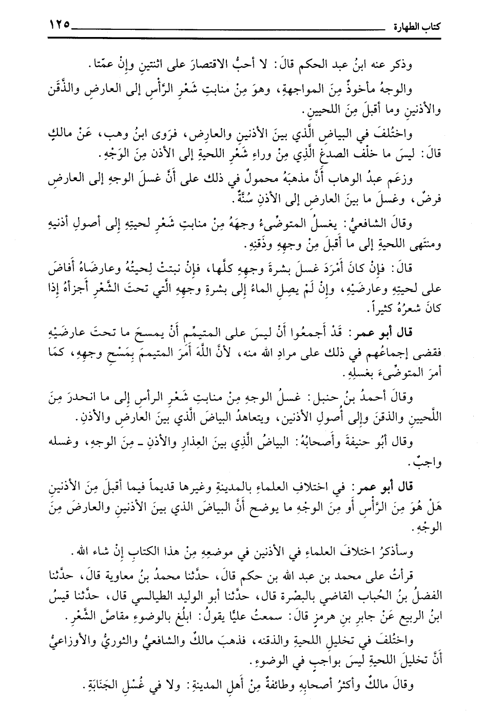 قَالَ أَبُو عُمَرَ فِي اخْتِلَافِ الْعُلَمَاءِ بِالْمَدِينَةِ وَغَيْرِهَا قَدِيمًا فِيمَا أَقْبَلَ مِنَ الْأُذُنَيْنِ هَلْ هُوَ مِنَ الرَّأْسِ أَوْ مِنَ الْوَجْهِ مَا يُوَضِّحُ أَنَّ الْبَيَاضَ الَّذِي بَيْنَ الْأُذُنَيْنِ وَالْعَارِضِ مِنَ الْوَجْهِ