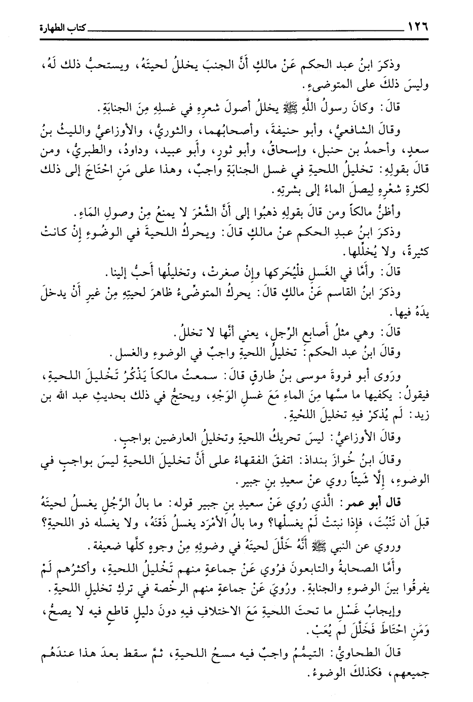 وذكر بن عَبْدِ الْحَكَمِ عَنْ مَالِكٍ أَنَّ الْجُنُبَ يُخَلِّلُ لِحْيَتَهُ وَيُسْتَحَبُّ ذَلِكَ لَهُ وَلَيْسَ ذَلِكَ عَلَى المتوضئ