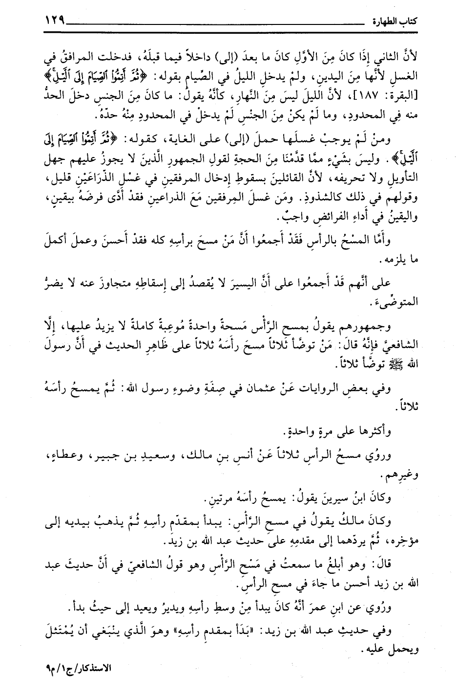 وَمَنْ لَمْ يُوجِبْ غَسْلَهَا حمل (إلى) على الغاية كقوله (ثم أَتِمُّوا الصِّيَامَ إِلَى اللَّيْلِ) وَلَيْسَ بِشَيْءٍ مِمَّا قَدَّمْنَا مِنَ الْحُجَّةِ لِقَوْلِ الْجُمْهُورِ الَّذِينَ لَا يَجُوزُ عَلَيْهِمْ جَهْلُ التَّأْوِيلِ وَلَا تَحْرِيفُهُ لِأَنَّ الْقَائِلِينَ بِسُقُوطِ إِدْخَالِ الْمِرْفَقَيْنِ فِي غَسْلِ الذِّرَاعَيْنِ قَلِيلٌ وَقَوْلُهُمْ فِي ذَلِكَ كَالشُّذُوذِ وَمَنْ غَسَلَ الْمِرْفَقَيْنِ مَعَ الذِّرَاعَيْنِ فَقَدْ أَدَّى فَرْضَهُ بِيَقِينٍ وَالْيَقِينُ فِي أَدَاءِ الْفَرَائِضِ وَاجِبٌ