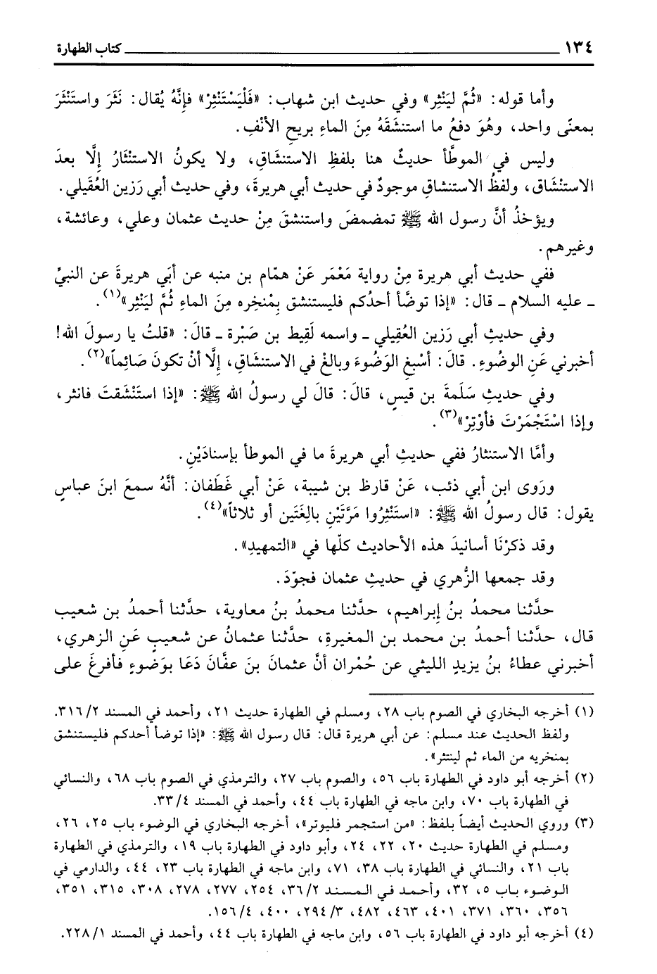وَأَمَّا الِاسْتِنْثَارُ فَفِي حَدِيثِ أَبِي هُرَيْرَةَ مَا فِي الموطأ بإسنادين