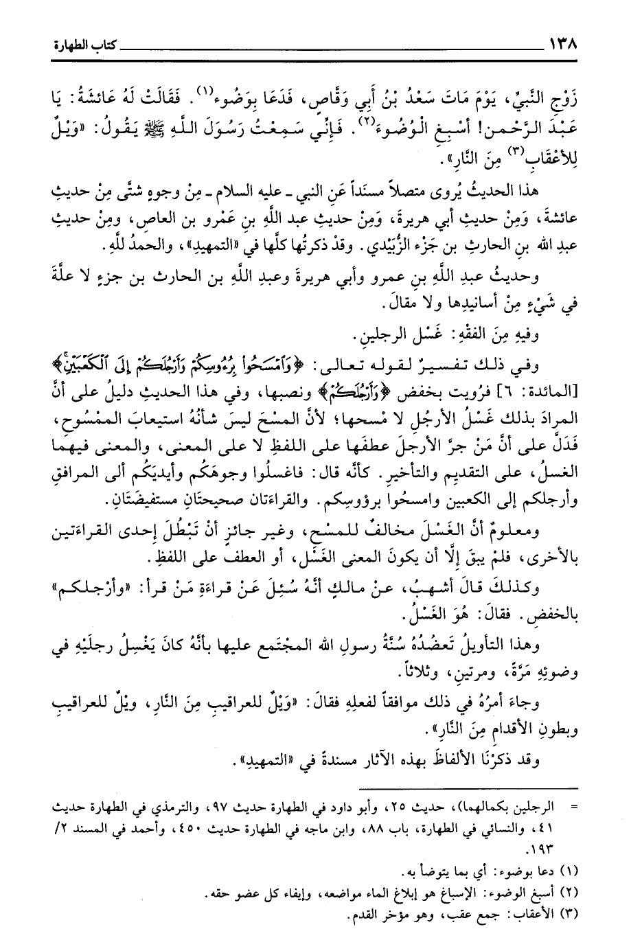 وَفِي ذَلِكَ تَفْسِيرٌ لِقَوْلِهِ تَعَالَى (وَامْسَحُوا بِرُءُوسِكُمْ وأرجلكم إلى الكعبين) المائدة 6 فرويت بخفض (وأرجلكم) وَنَصْبِهَا وَفِي هَذَا الْحَدِيثِ دَلِيلٌ عَلَى أَنَّ الْمُرَادَ بِذَلِكَ غَسْلُ الْأَرْجُلِ لَا مَسْحُهَا لِأَنَّ الْمَسْحَ لَيْسَ شَأْنُهُ اسْتِيعَابَ الْمَمْسُوحِ فَدَلَّ عَلَى أَنَّ مَنْ جَرَّ الْأَرْجُلَ عَطَفَهَا عَلَى اللَّفْظِ لَا عَلَى الْمَعْنَى وَالْمَعْنَى فِيهِمَا الْغَسْلُ عَلَى التَّقْدِيمِ وَالتَّأْخِيرِ كَأَنَّهُ قَالَ فَاغْسِلُوا وُجُوهَكُمْ وَأَيْدِيَكُمْ إلى المرافق وأرجلكم إلى الكعبين وامسحوا برؤوسكم وَالْقِرَاءَتَانِ صَحِيحَتَانِ مُسْتَفِيضَتَانِ