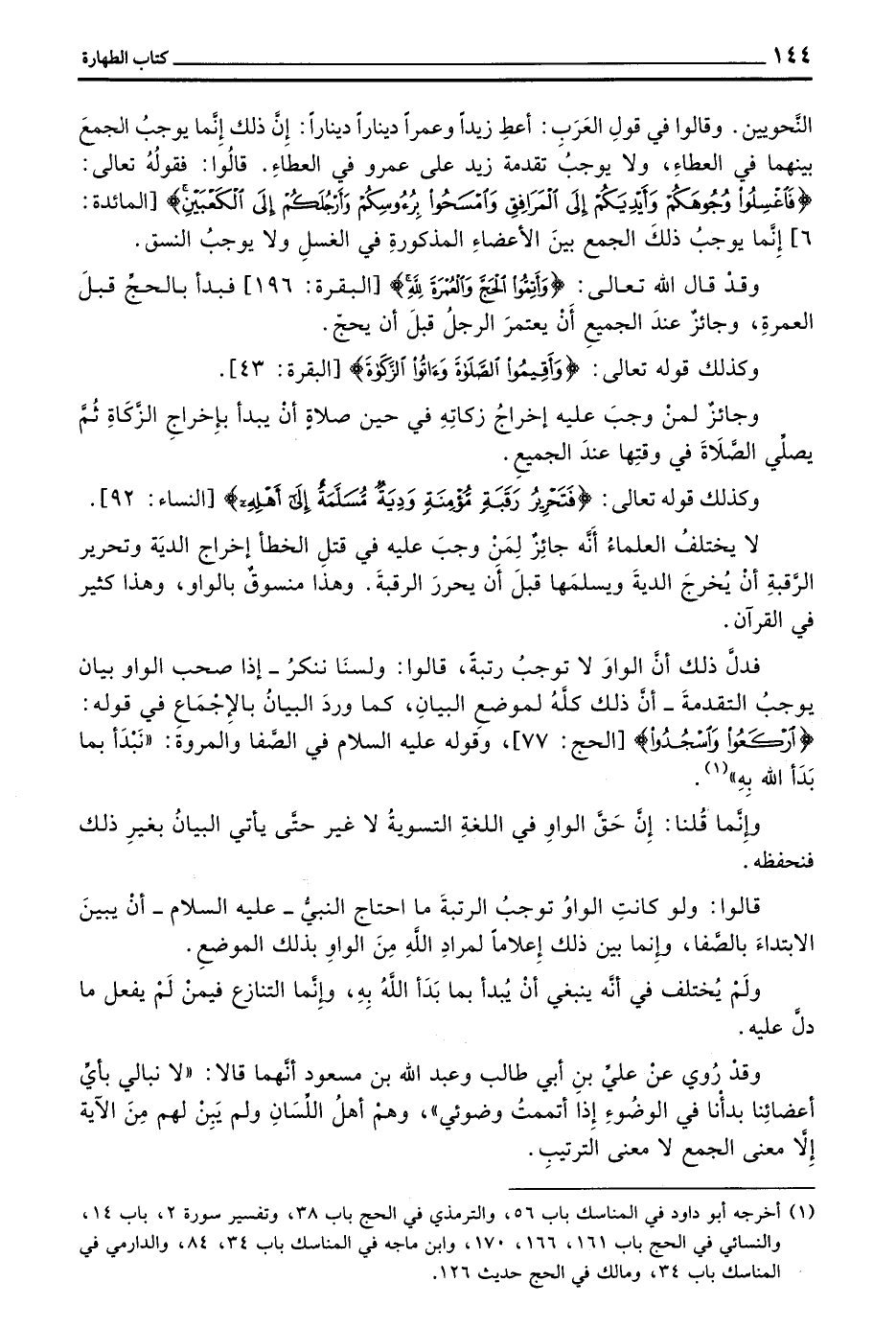 فَدَلَّ ذَلِكَ أَنَّ الْوَاوَ لَا تُوجِبُ رُتْبَةً قَالُوا وَلَسْنَا نُنْكِرُ - إِذَا صَحِبَ الْوَاوَ بَيَانٌ يُوجِبُ التَّقْدِمَةَ - أَنَّ ذَلِكَ كُلَّهُ لِمَوْضِعِ الْبَيَانِ كَمَا وَرَدَ الْبَيَانُ بِالْإِجْمَاعِ فِي قَوْلِهِ (ارْكَعُوا وَاسْجُدُوا) الْحَجِّ 77 وَقَوْلِهِ عَلَيْهِ السَّلَامُ فِي الصَّفَا وَالْمَرْوَةِ ((نَبْدَأُ بِمَا بَدَأَ اللَّهُ بِهِ))