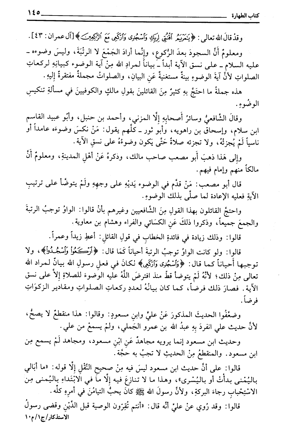 وَمَعْلُومٌ أَنَّ السُّجُودَ بَعْدَ الرُّكُوعِ وَإِنَّمَا أَرَادَ الْجَمْعَ لَا الرُّتْبَةَ وَلَيْسَ وُضُوءُهُ - عَلَيْهِ السَّلَامُ - عَلَى نَسَقِ الْآيَةِ أَبَدًا - بَيَانًا لِمُرَادِ اللَّهِ مِنْ آيَةِ الْوُضُوءِ كَبَيَانِهِ لِرَكَعَاتِ الصَّلَوَاتِ لِأَنَّ آيَةَ الْوُضُوءِ بَيِّنَةٌ مُسْتَغْنِيَةٌ عَنِ الْبَيَانِ وَالصَّلَوَاتُ مُجْمَلَةٌ مُفْتَقِرَةٌ إِلَيْهِ
