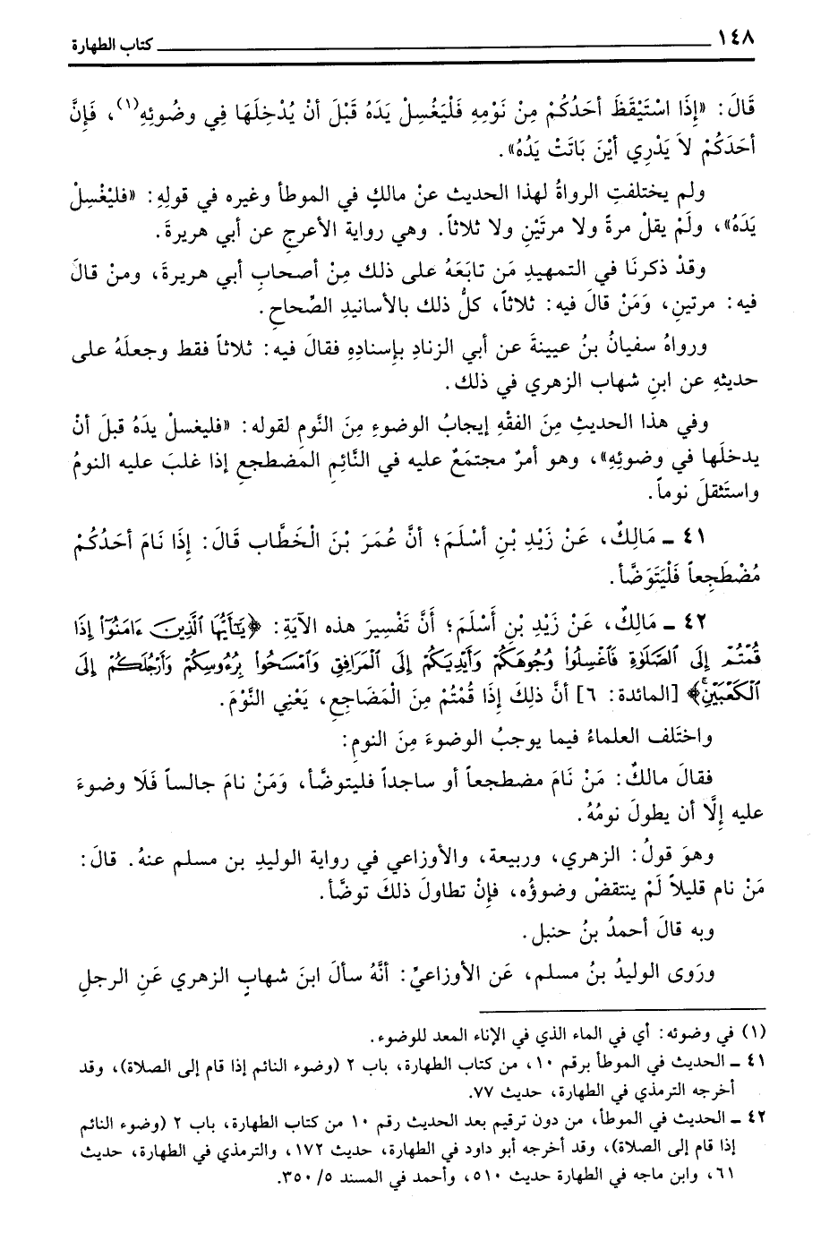 42 - مَالِكٌ عَنْ زَيْدِ بْنِ أَسْلَمَ أَنَّ تَفْسِيرَ هذه الآية (يا أيها الَّذِينَ آمَنُوا إِذَا قُمْتُمْ إِلَى الصَّلَاةِ فَاغْسِلُوا وجوهكم وأيديكم إلى المرافق وامسحوا برؤوسكم وَأَرْجُلَكُمْ إِلَى الْكَعْبَيْنِ) الْمَائِدَةِ 6 أَنَّ ذَلِكَ إِذَا قُمْتُمْ مِنَ الْمَضَاجِعِ يَعْنِي النَّوْمَ